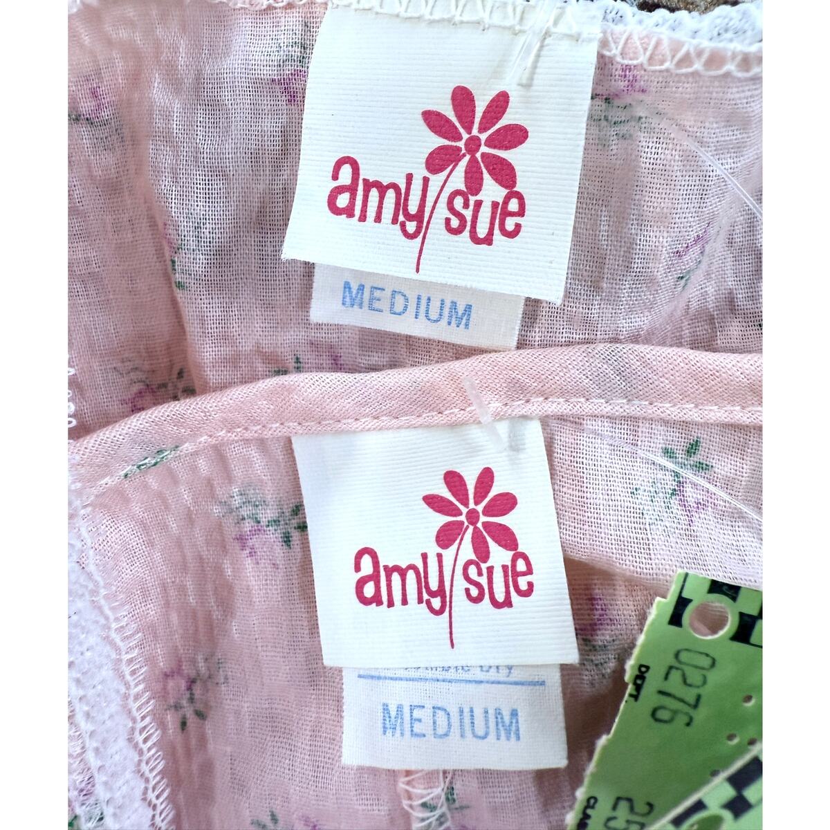 Amy Sue was a mid-century sleepwear label commonly found in American department stores during the 1960s and 1970s. These sets were designed for comfortable at-home lounging, combining easy-care synthetic blends with feminine trims such as lace yokes, bows, and floral prints.