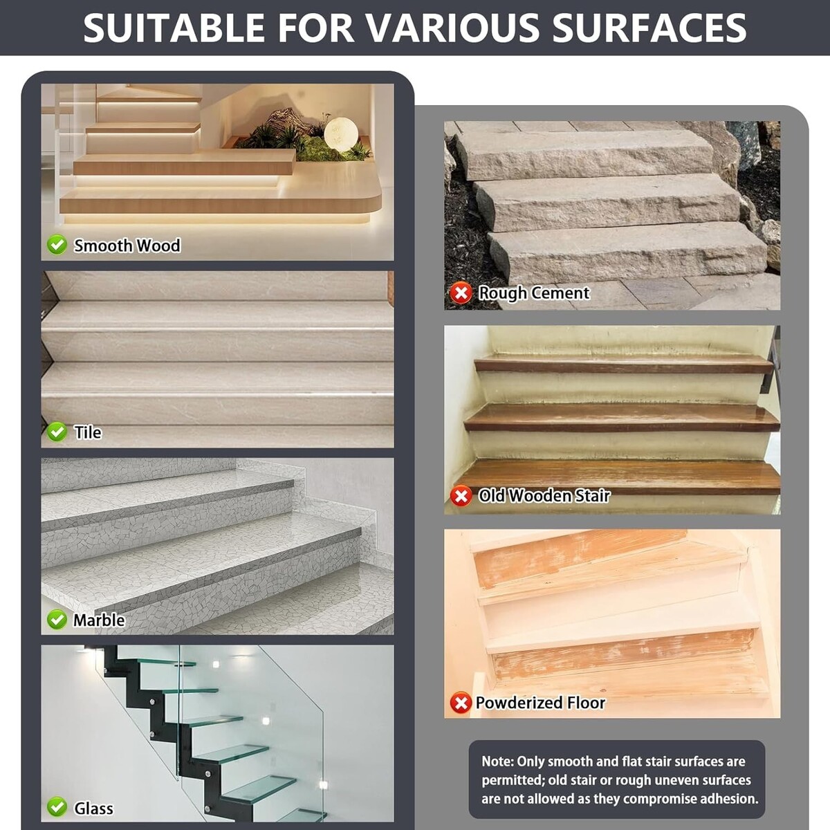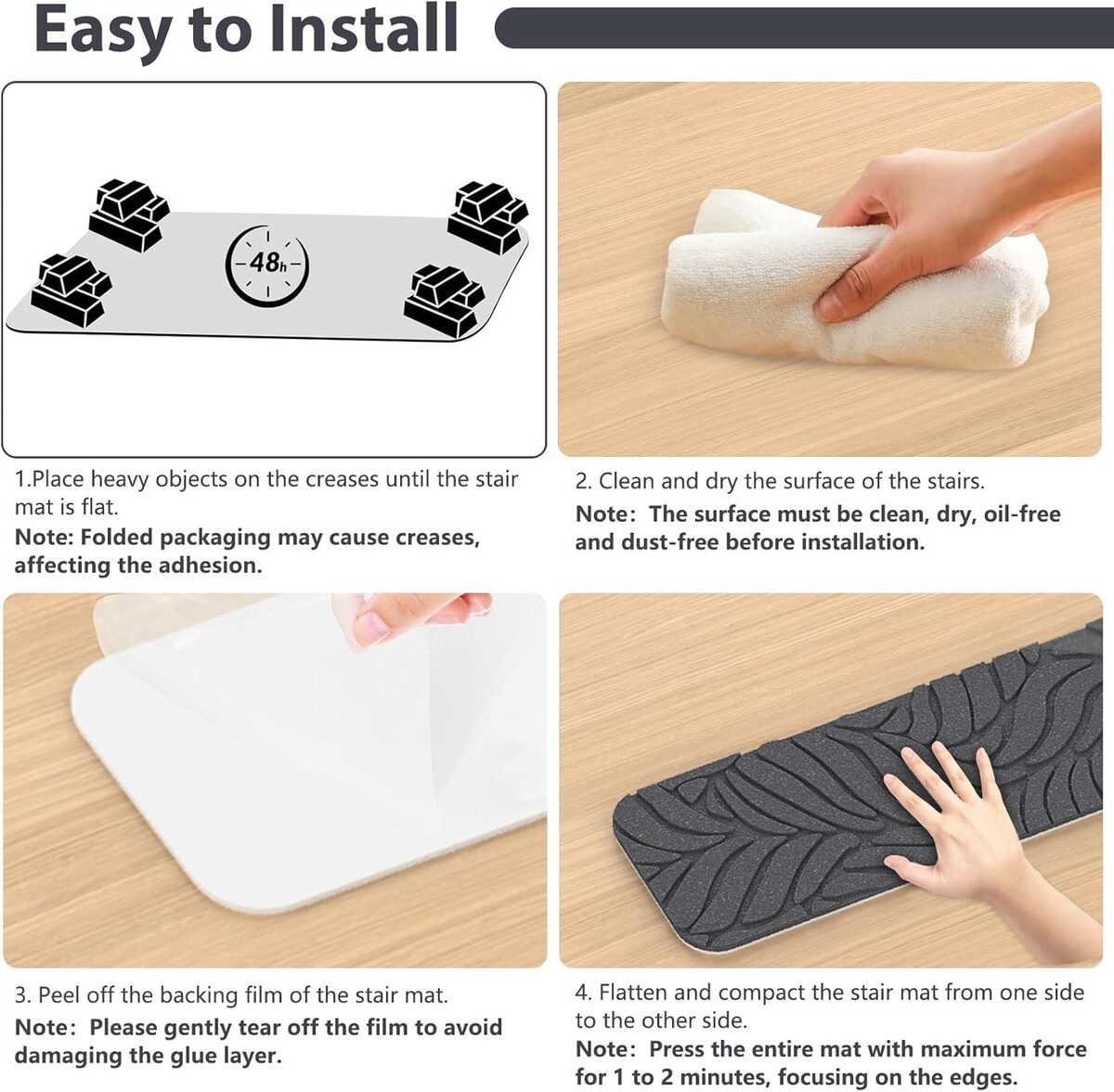 Easy Installation: Simply clean and dry your stairs, peel off the backing film, and press the treads down for secure placement.