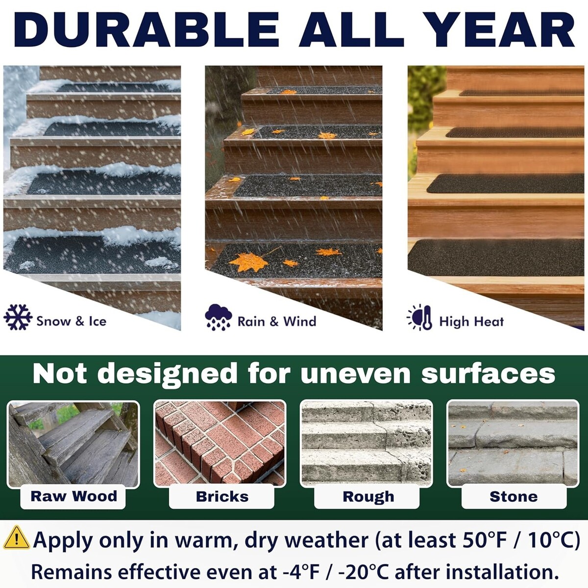 Waterproof, weather-resistant grip strips for reliable traction, even in rain or snow.