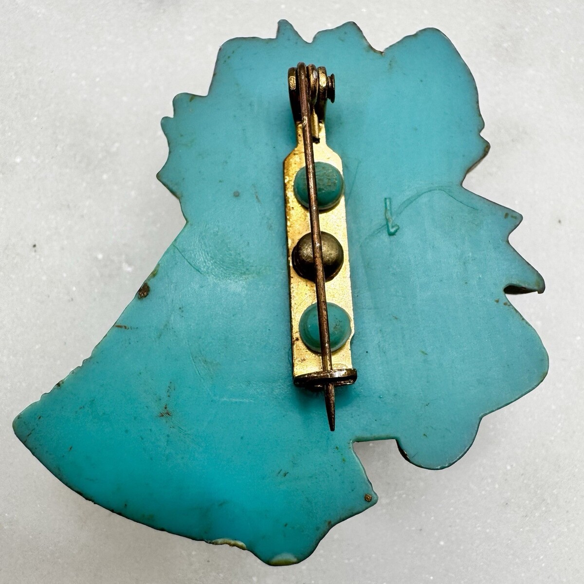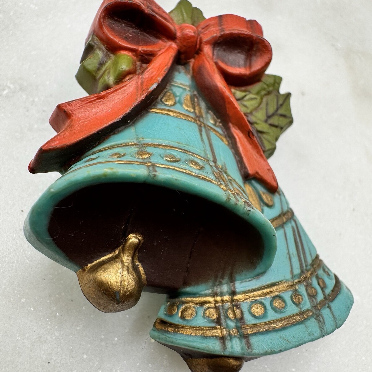 This festive vintage Christmas brooch features a pair of bells in an unusual turquoise blue color, accented with gold detailing, a bright red bow, and green holly leaves. The dimensional design gives the bells nice depth, with small clappers visible beneath that add extra character. The blue bells make this piece stand out from the more common gold or red versions and give it a unique holiday look. Perfect for a coat, sweater, scarf, or festive Christmas outfit.
