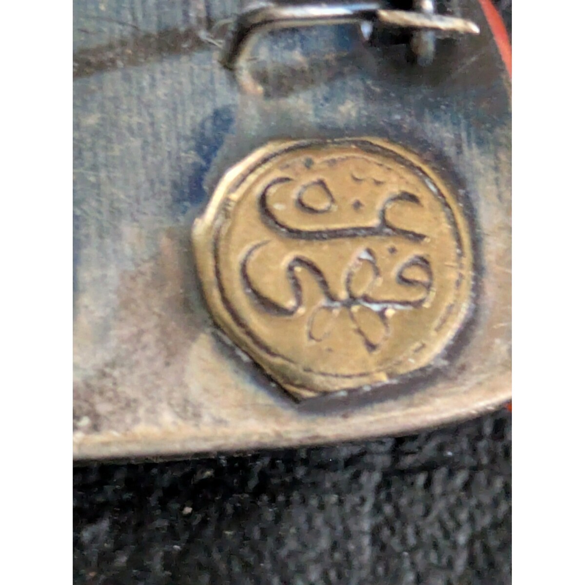 VintageAzz Fahmy Houses Of Nile Sterling Silber Türkis gyptische Nubische Pin Brosche. Dieses einzigartige Stück besteht aus einem grob geschliffenen türkisfarbenen Stein als Baum- oder Dachelement sowie einem leuchtend roten Korallenzweig. Der silberfarbene Korper weist aufwendige Filigranarbeit an der Kuppel und den ausgeschnittenen windows auf, wahrend die Rückseite zwei deutliche goldfarbene kalligraphische Stempel aufweist. Ein wunderschones Beispiel für handgefertigten Ethno-Schmuck mit sicherer Nadelrückseite.