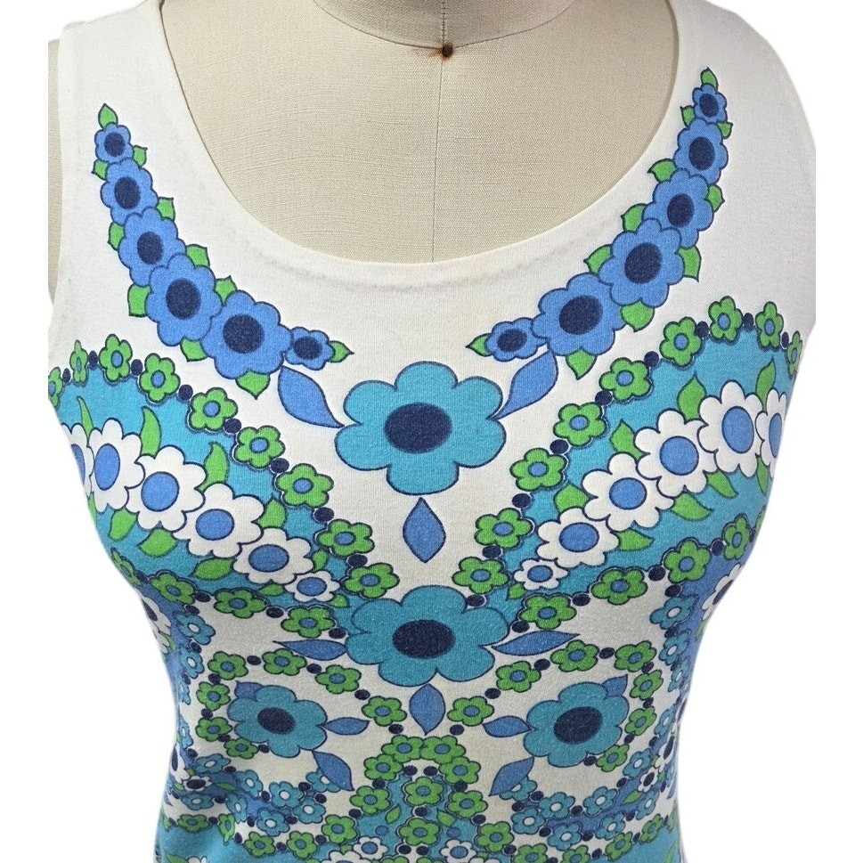 VTG 1960s–70s Blue Green Mod Floral Cotton Tank Top S/M 100% Cotton Knit S