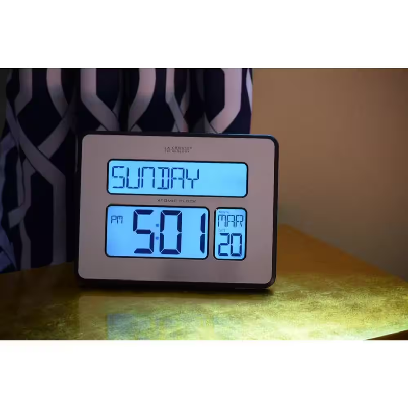 Atomic Full Calendar Brushed Silver Digital Clock with Extra Large Digits & Back