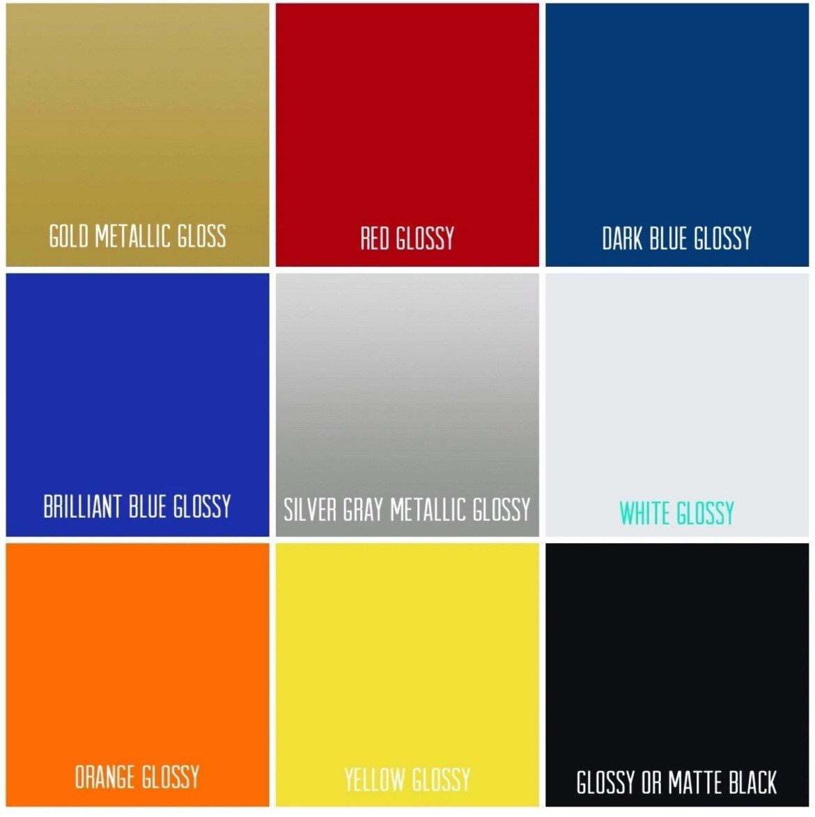 Available colors: (Glossy Black, Matte Black, Glossy Red, Glossy Yellow, Glossy Silver, Glossy Orange, Glossy Blue Glossy White)