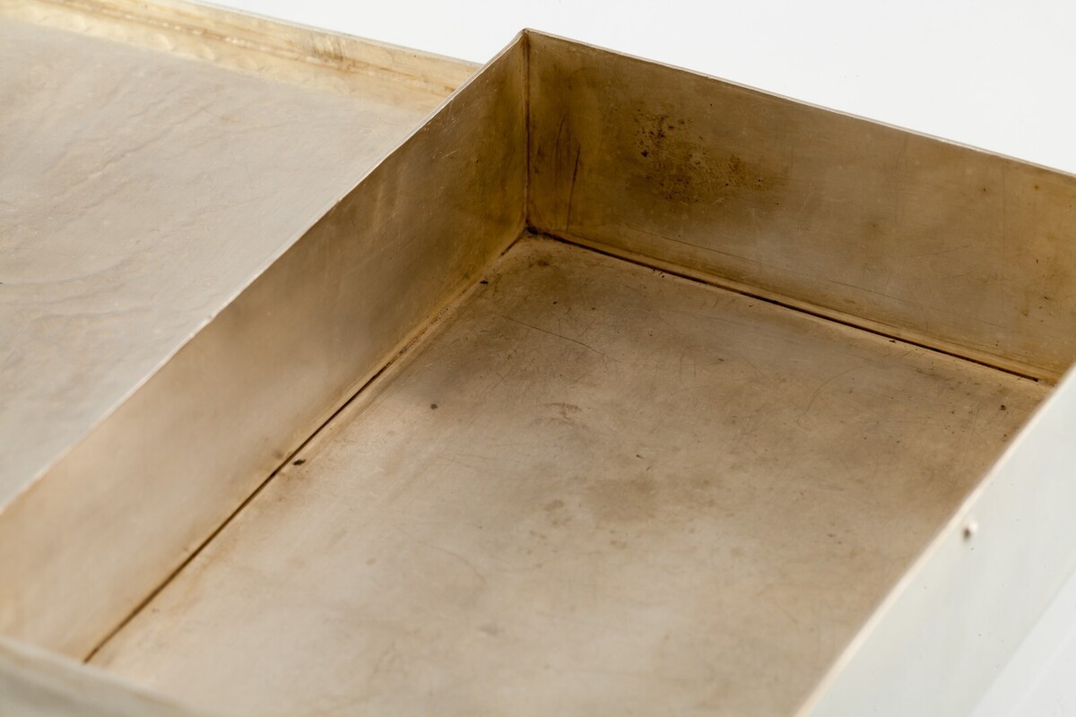 Condition: Good vintage condition; many scratches visible on the exterior of the box; signs of use on interior of box as well