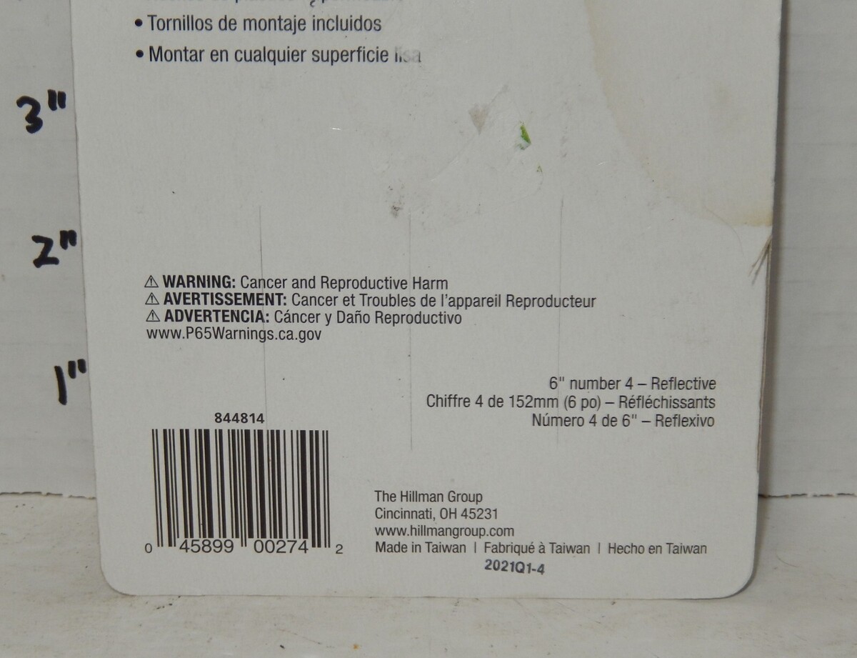 For Sale is a Hillman 6" Plastic Weatherproof Reflective Number 4 Four with Mounting Screws 844814. it in good condition as seen in the pictures provided what you see is what you will receive. Please ask Any and All Questions prior to purchasing. Fast Same or Next day shipping with Free Delivery Confirmation within the U.S. Payment Due within 7 days of purchase (if you need more time please let us know In advance) we love to combine shipping is always a Yes and Most of the time Additional Items Ship for free.