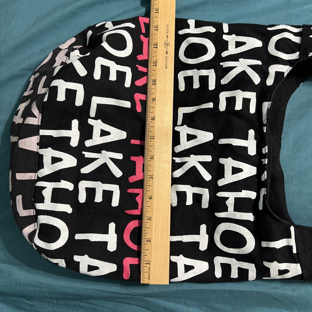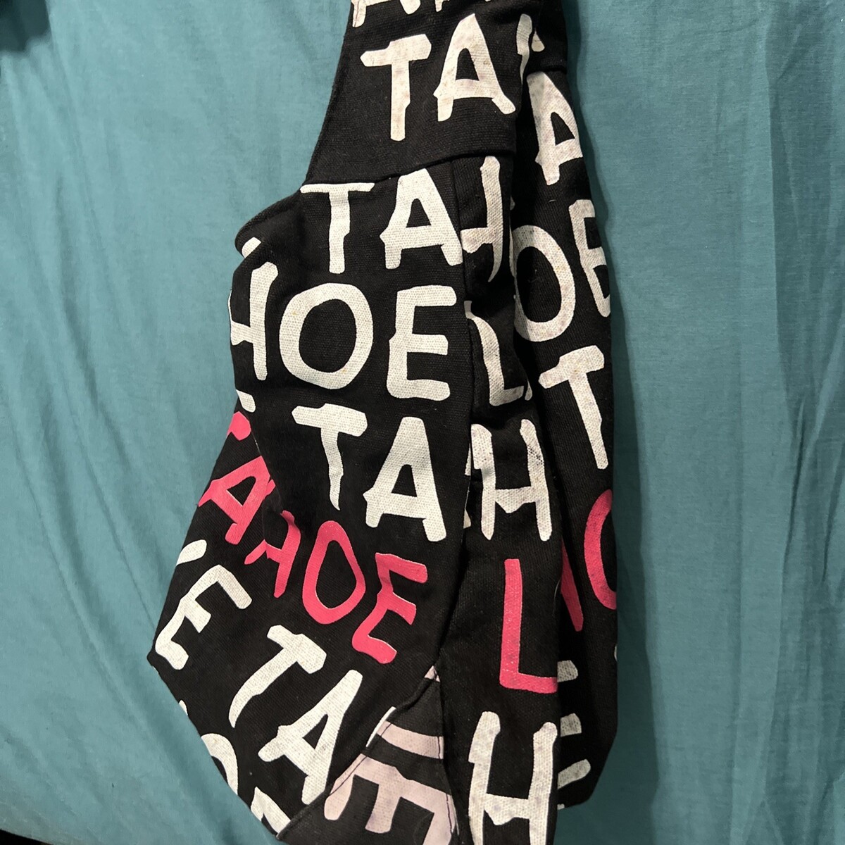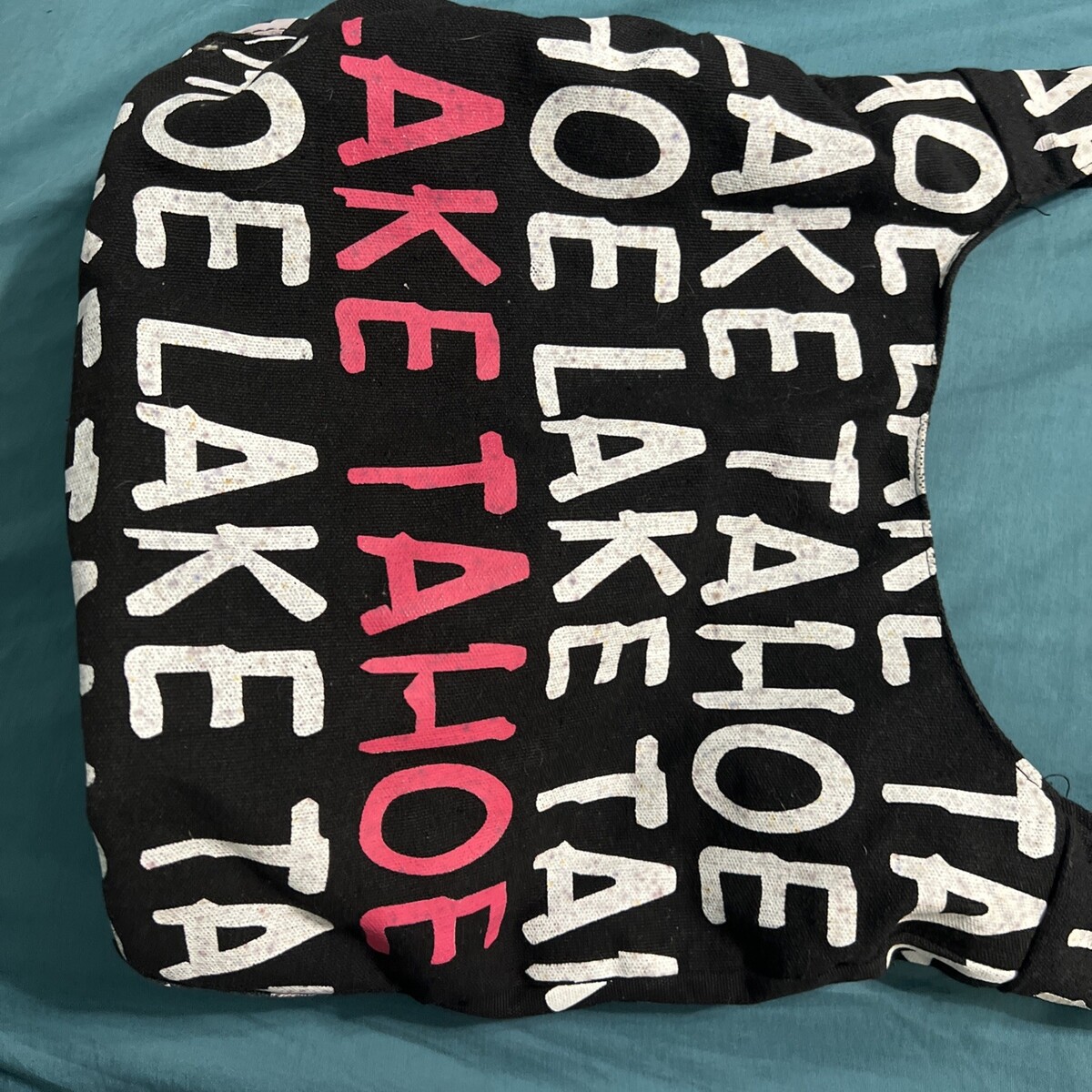 The Lake Tahoe Unbranded Tote Snap Closure Crossbody Canvas Purse Bag in black with white and pink lettering features a stylish crossbody design perfect for women on the go. The snap closure ensures your belongings are secure while the silver hardware adds a touch of elegance. Made from durable cotton canvas with a black lining, this versatile purse is both practical and fashionable, making it a must-have accessory for any outfit.