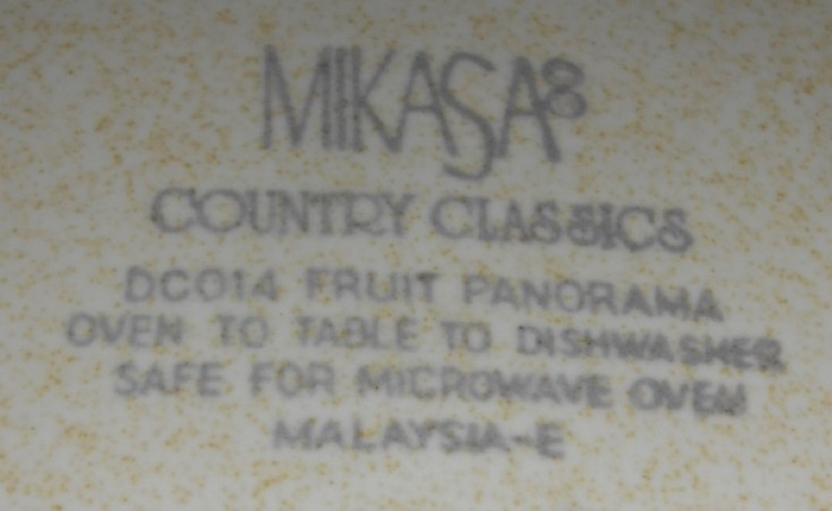 This is a Set of (2) 12 1/4" Chop Plates or Platters and (1) 10 1/2" Serving or Vegetable Bowl from Mikasa Country Classics in the Fruit Panorama Pattern. They are all in good pre-owned condition with no chips or cracks. ***The mark shown above in photo is from one of the bowls...some of the marks may vary slightly***.