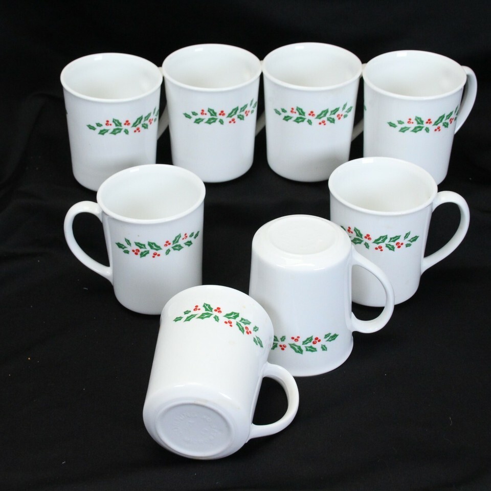 Corelle Winter Holly Mugs 3-3/4" White Vein Lot of 8 Christmas Xmas