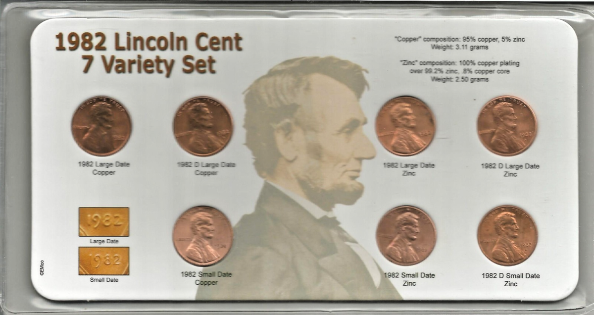 1982 Lincoln Cent 7 Coin Variety Set; BU; in Plastic Sleeve on Full Color Card