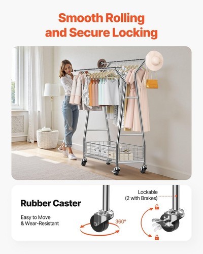 Flexible Mobility: The rolling clothes rack comes with 4 smooth 360 swivel wheels, 2 with locks to keep it in place. Rubber casters roll quietly and protect floors from scratches, ensuring stability and safety while moving or standing still