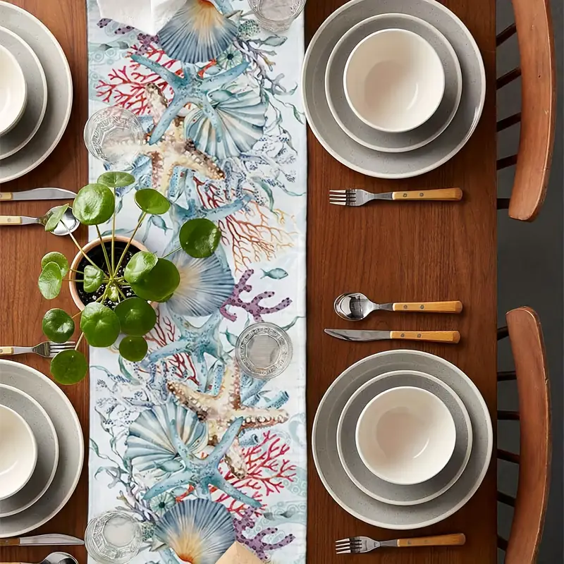 This Blue Ocean Coastal Theme Table Runner features a Modern Linens design with a charming Ocean Life pattern, perfect for adding a touch of sea life to your dining table.