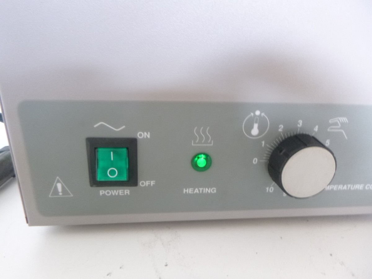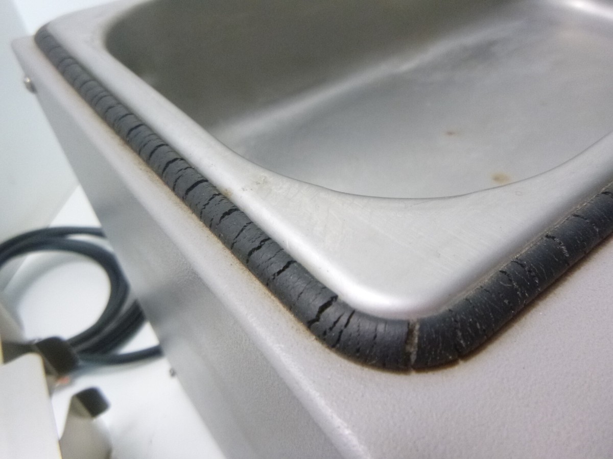 This bath powers on and heats up fine. The rubber seal around the edges of the pan is cracked, as shown in the pictures, but it does seem to be intact.