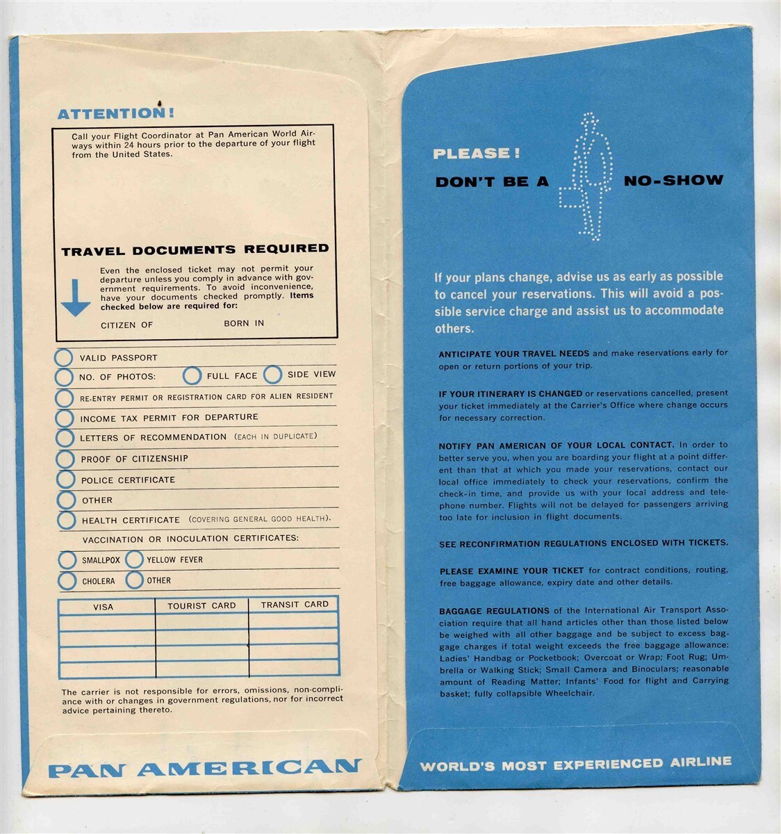 Pan American World Airways Ticket Jacket Travel Documents Required