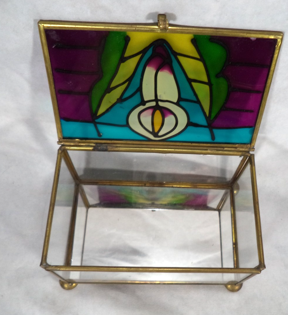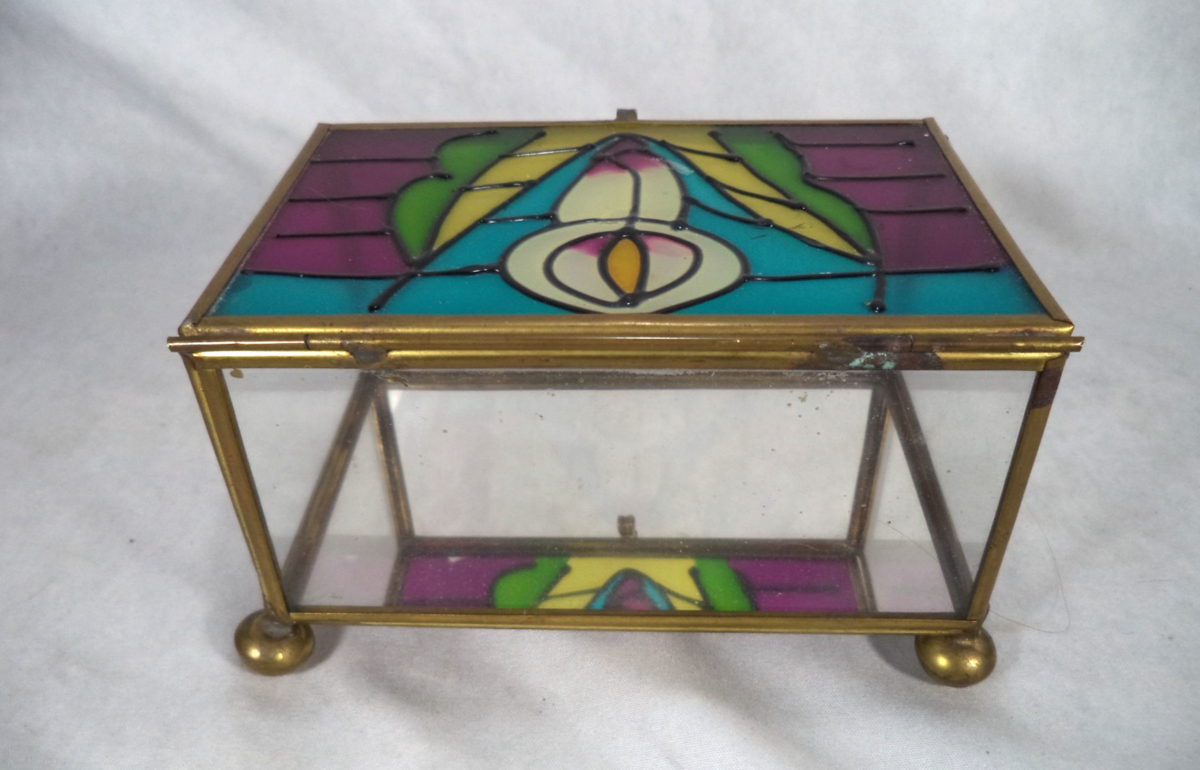 Vintage Stained Glass Trinket Box Floral Brass Glass Jewelry Keepsake