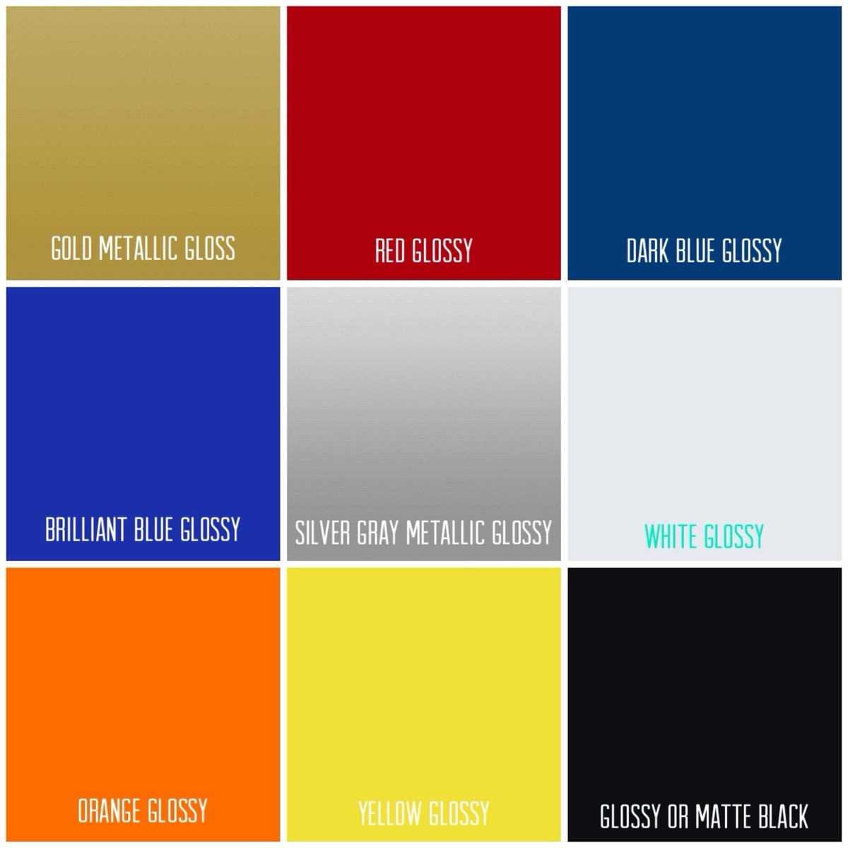 Available colors: (Glossy Black, Matte Black, Glossy Red, Glossy Yellow, Glossy Silver, Glossy Orange, Glossy Blue Glossy White)