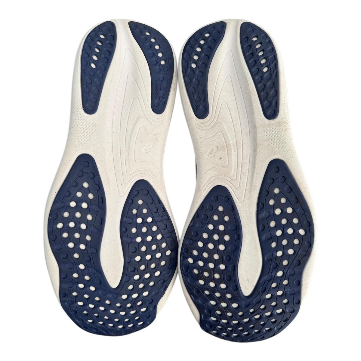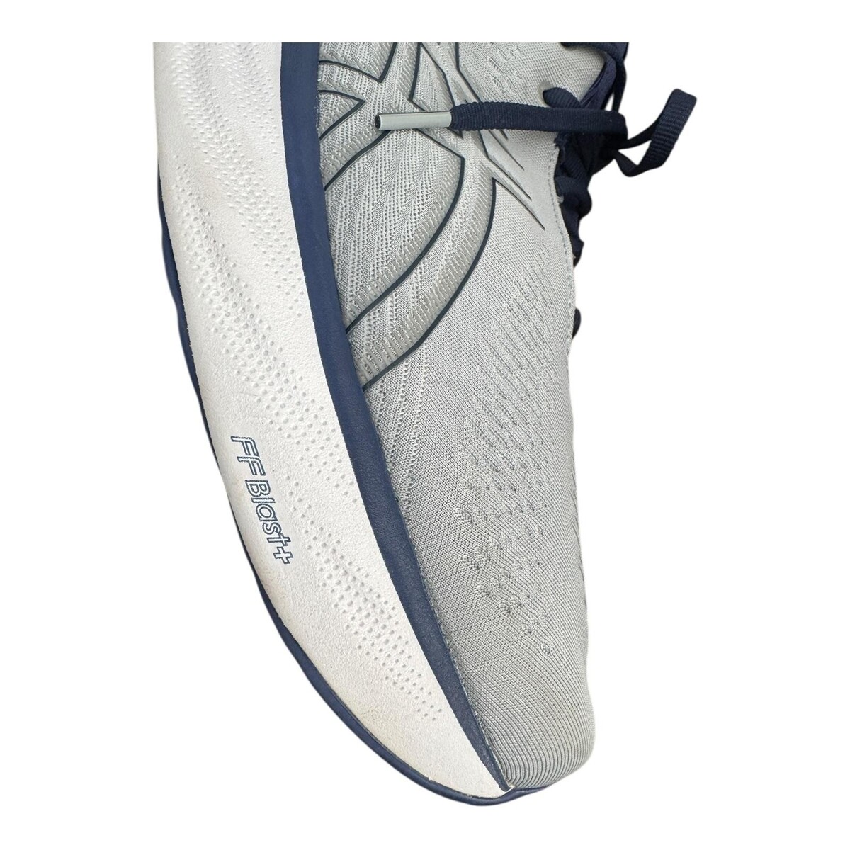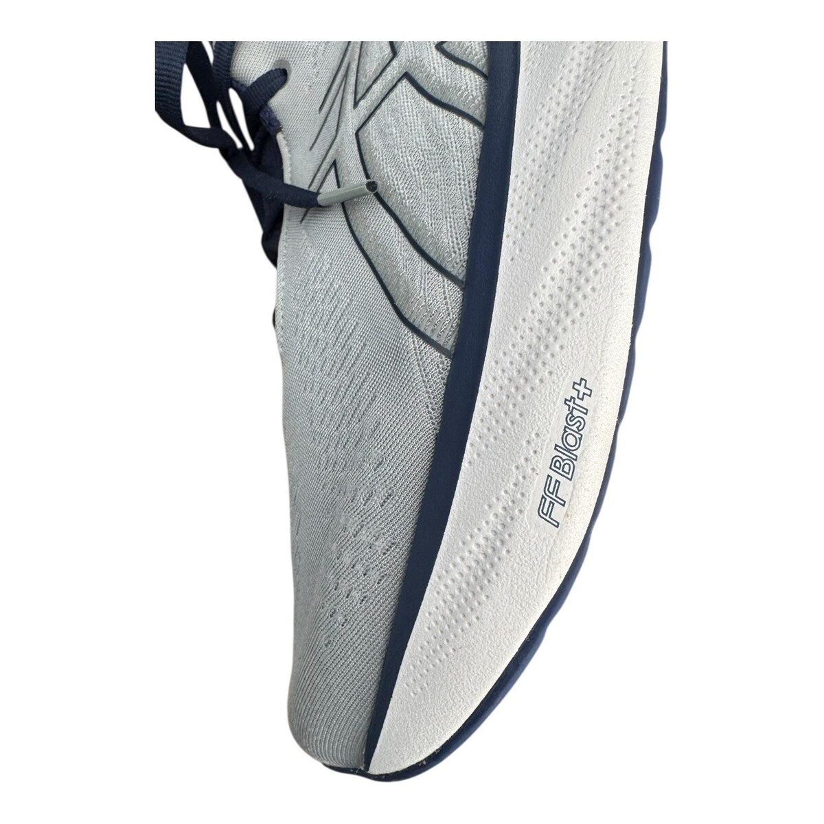 Thick white midsoles are labeled FF Blast+ and PureGEL, delivering lightweight cushioning and impact absorption over durable rubber outsoles with navy traction pods.