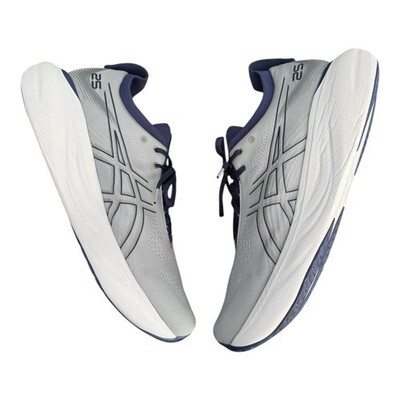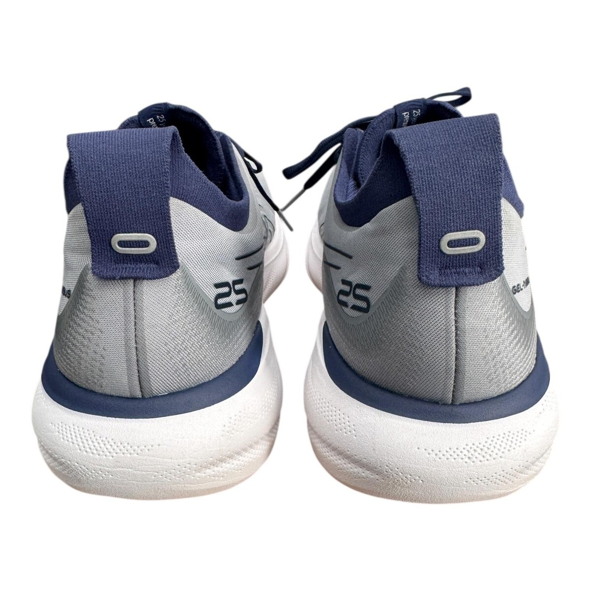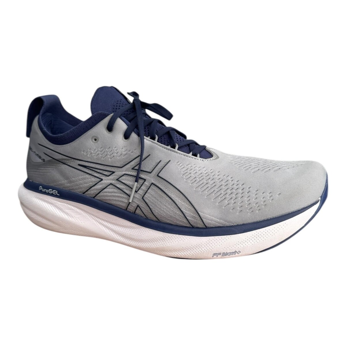 ASICS GEL-Nimbus 25 men's running shoes in a gray and navy colorway, tagged size US 15.