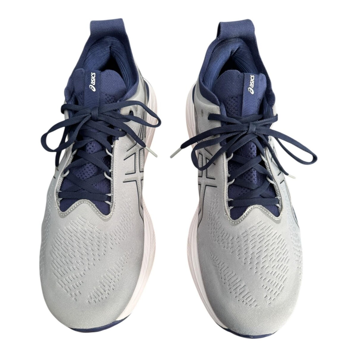 Engineered mesh uppers feature subtle knit ventilation zones, printed ASICS side stripes, tonal stitching, and a traditional lace-up closure with flat navy laces.