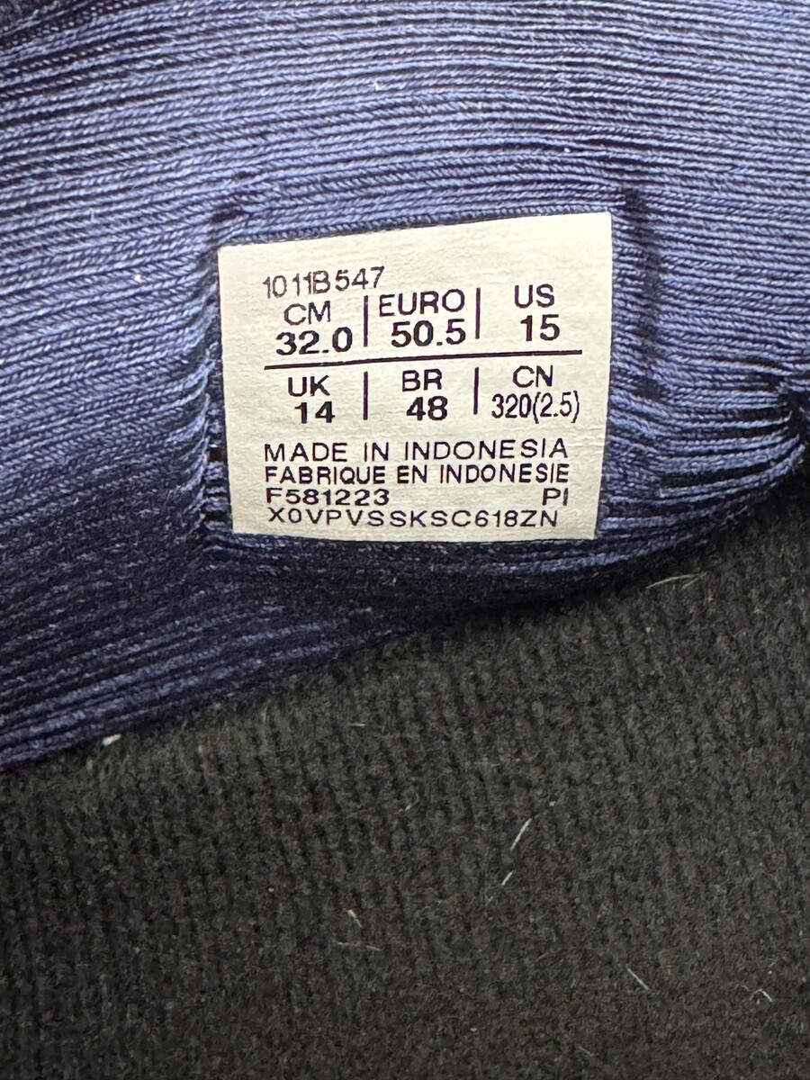 Inner size label details: mens US 15, UK 14, EU 50.5, cm 32.0, BR 48, CN 320(2.5); style code 1011B547.