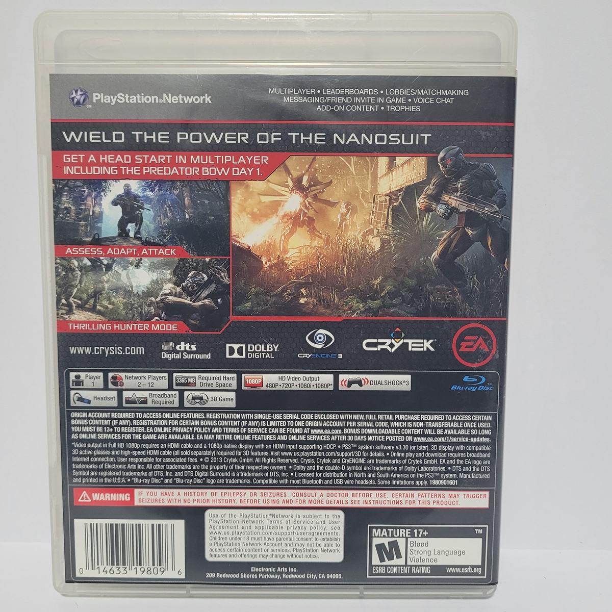 Immerse yourself in the thrilling world of Crysis 3 - Hunter Edition, the latest addition to the Crysis series. This PlayStation 3 game offers online playability, allowing you to compete with players from all over the world. The game features a mature rating and is compatible with NTSC-U/C (US/Canada) region codes. This unit comes with a manual and is of the shooter genre, with the game's publisher being Electronic Arts. The game was released in 2013 and is part of the Crysis series. The platform is Sony PlayStation 3, and the game is made in the United States. Purchase this game today and experience the adrenaline rush of online gaming.