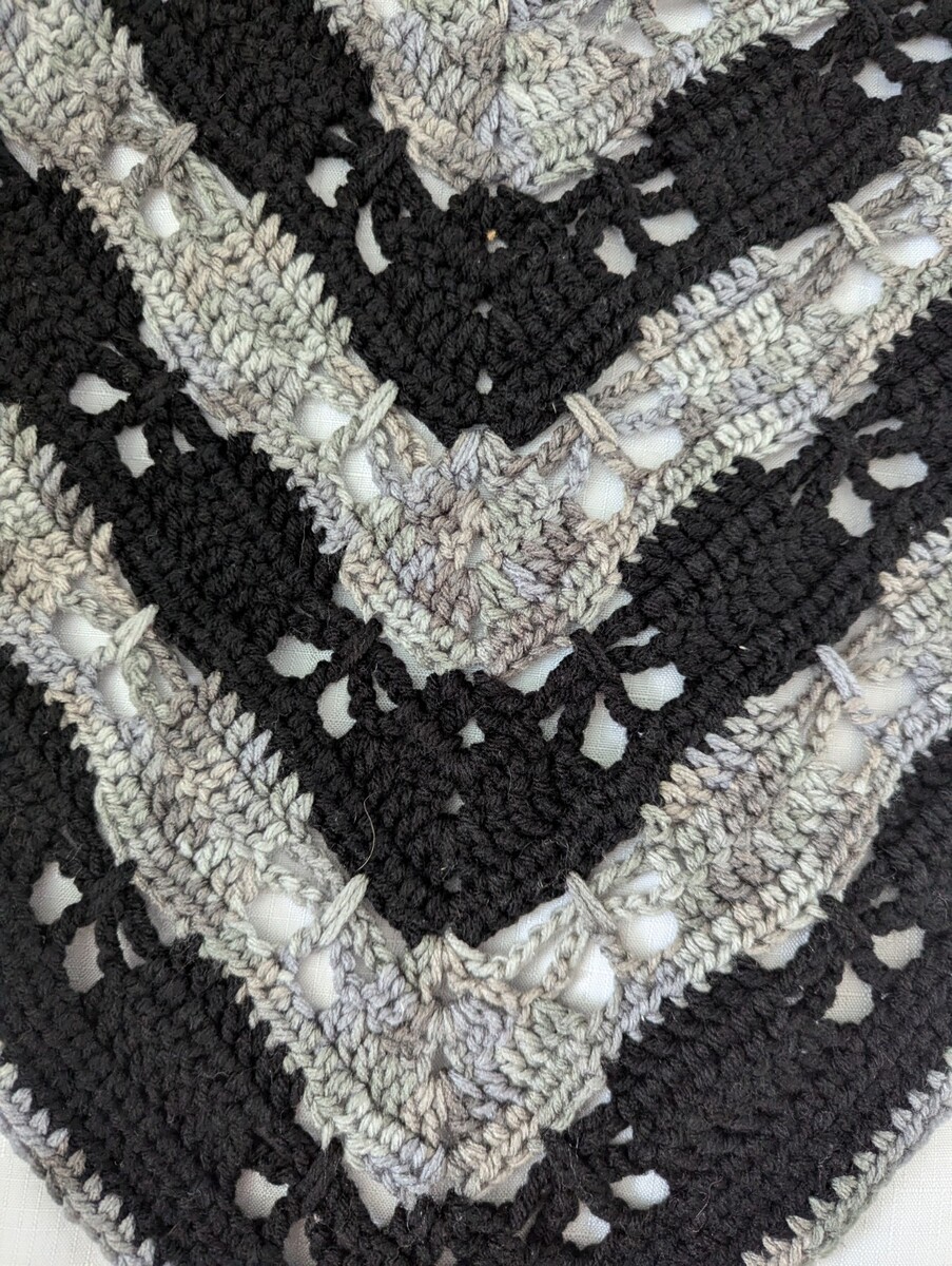 This black and gray variegated shawl is medium weight. Most shawls were crocheted with Red Heart acrylic yarn.