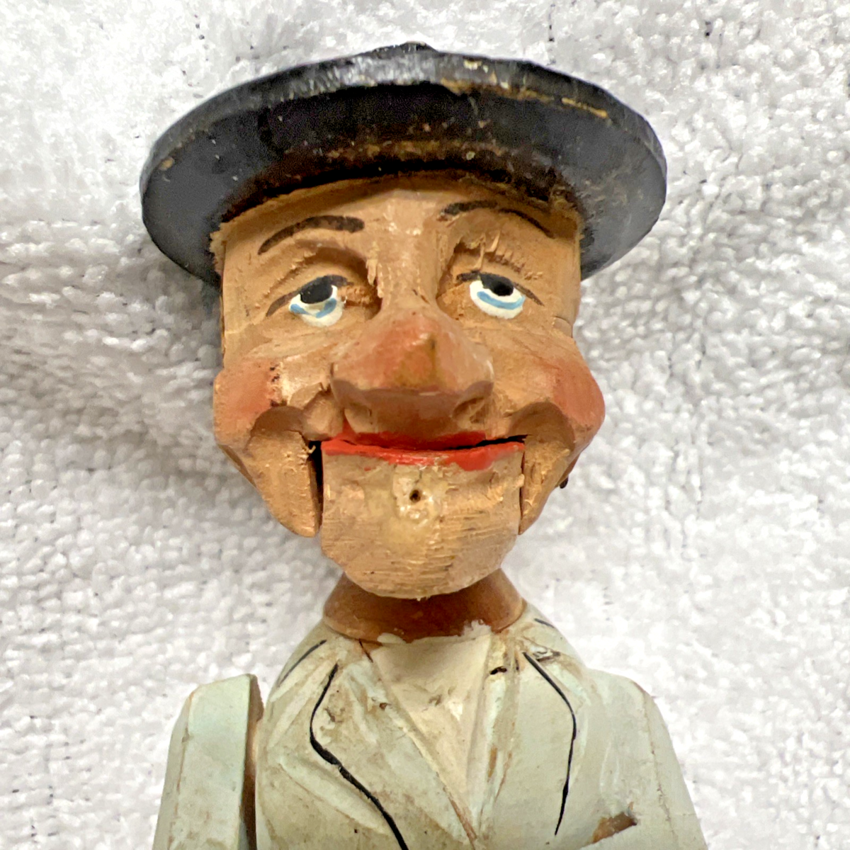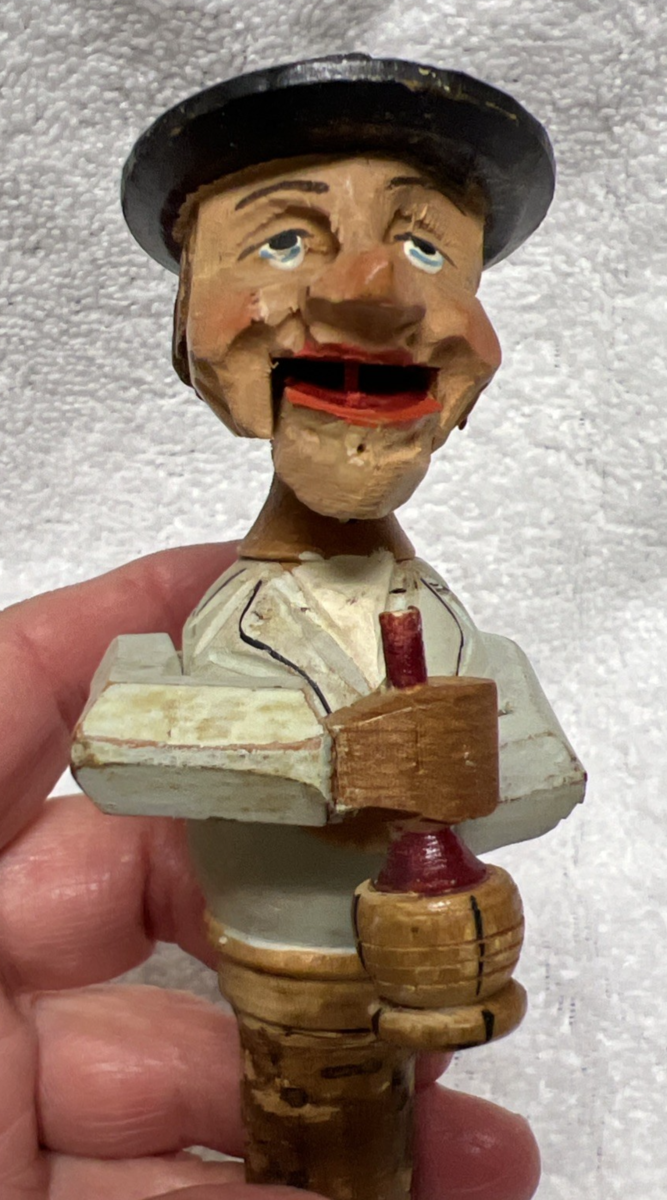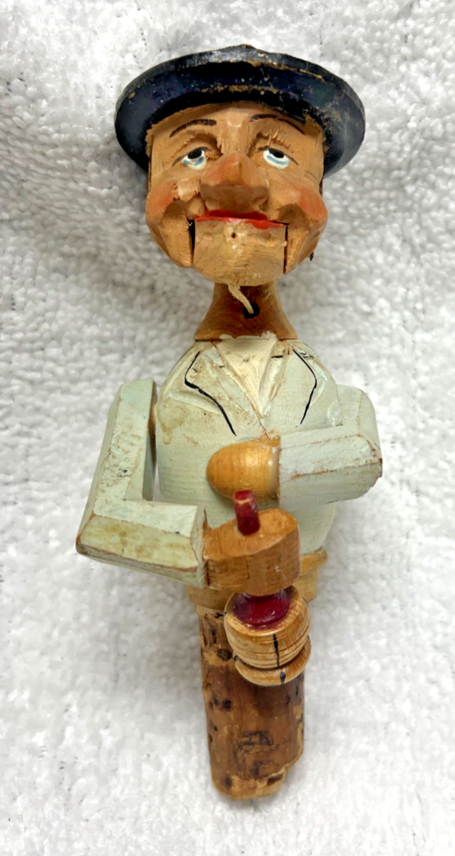 Vintage Mechanical Bottle Cork Man Drinking Bottle of Wine Carved Wood