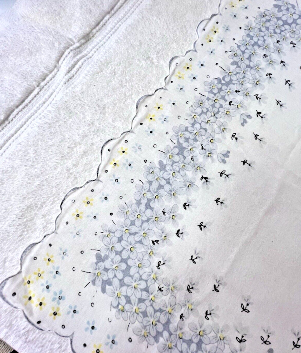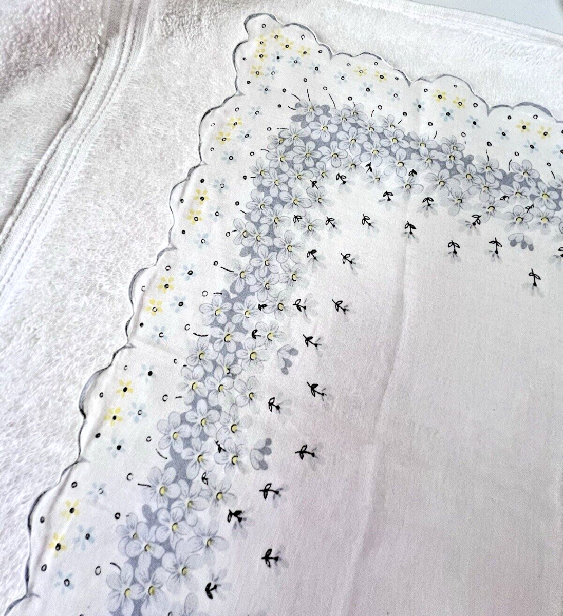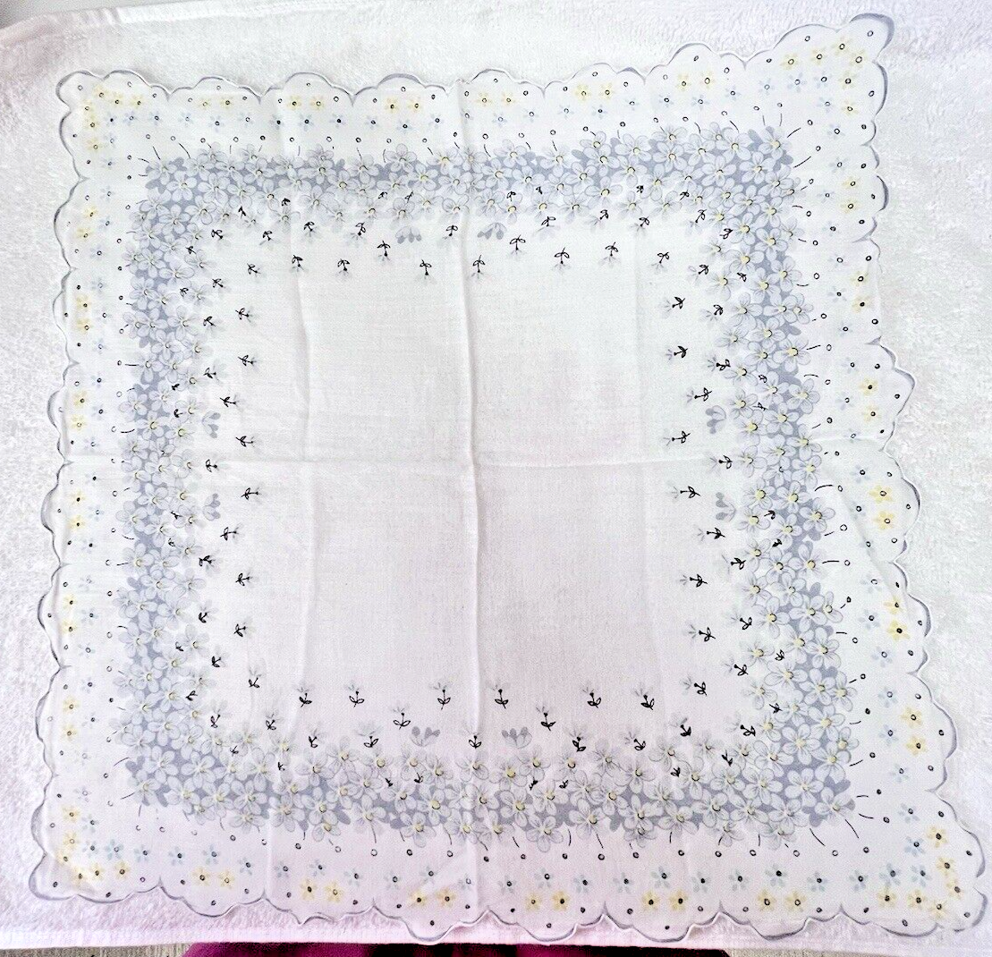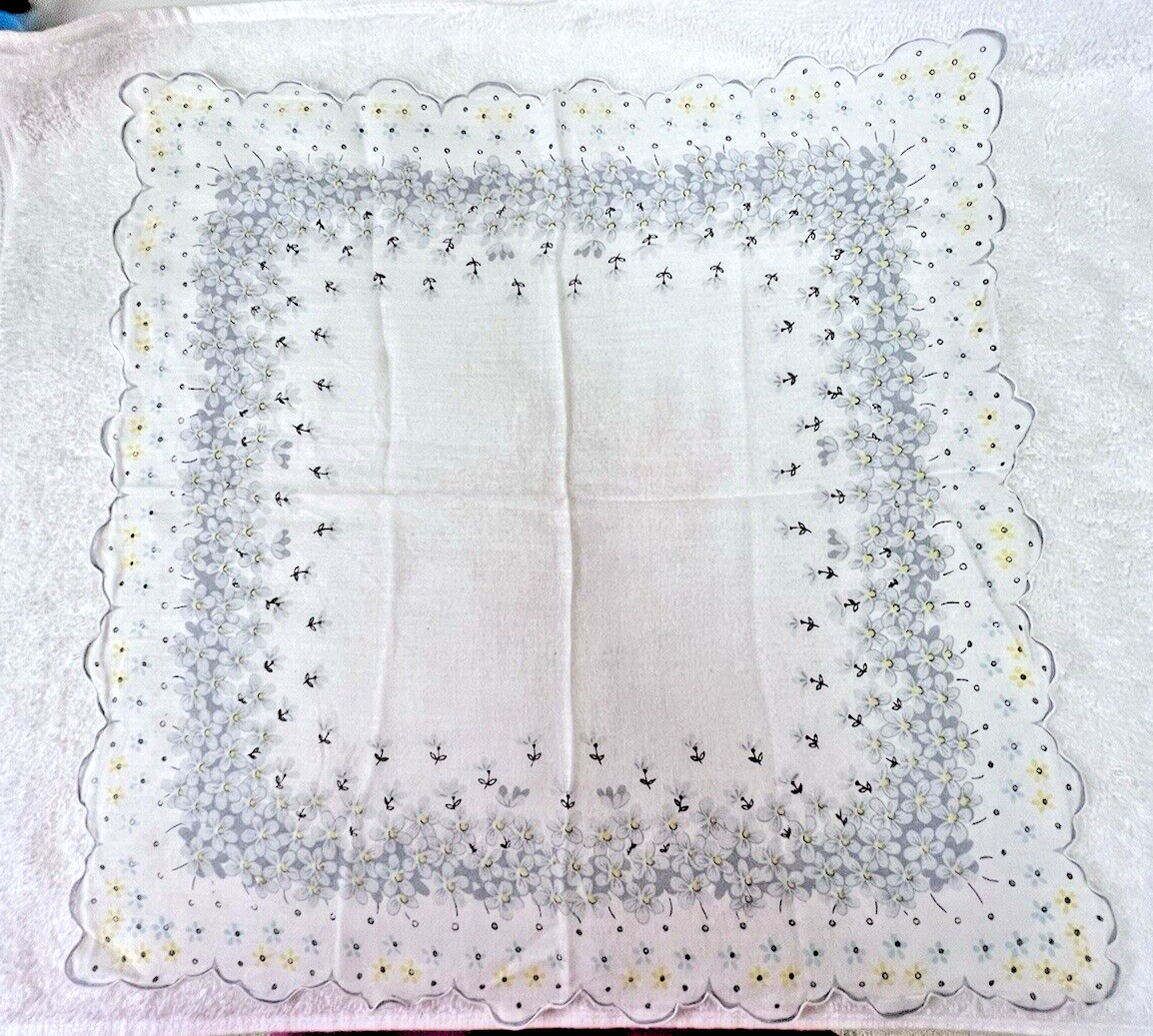 Vintage Hankie 1000's Tiny Flowers Grey Blue Yellow Scalloped Edge 14 Inch