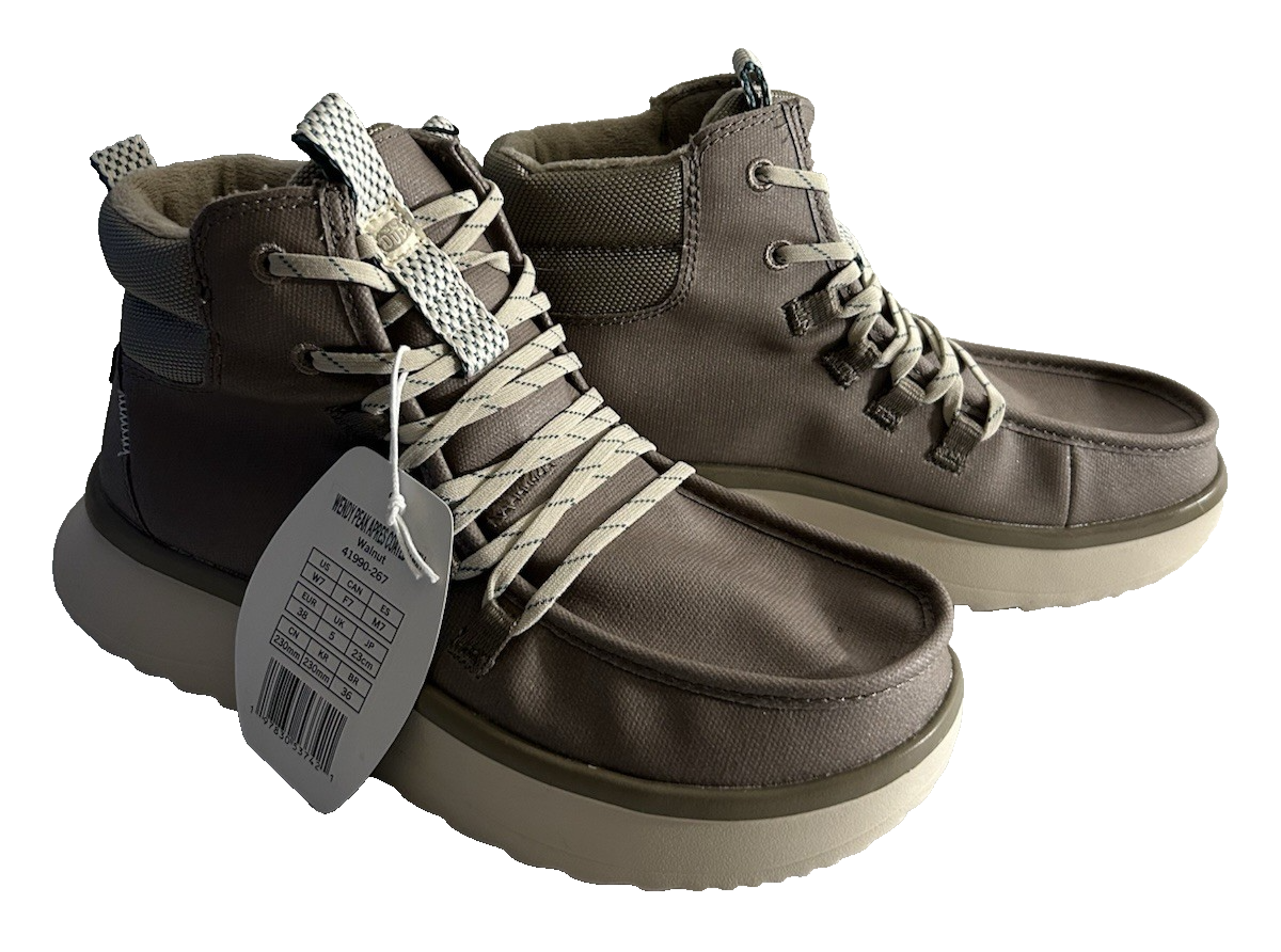 The NEW Wendy Peak Apres Coated Twill Boots in Walnut are women's boots by the brand Hey Dude. These stylish boots are in size 7 and feature a classic walnut color. Made with coated twill material, they offer a personalized feel while maintaining a sleek and modern look. The boots are perfect for adding a touch of sophistication to any outfit, making them a must-have for any woman's shoe collection.