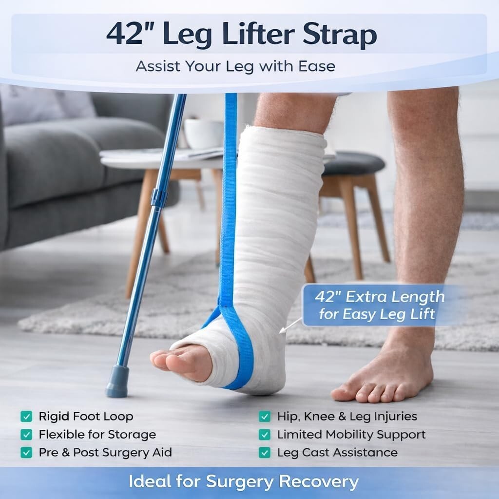 Durable leg lifter strap safely raises legs onto beds, sofas, or vehicles.