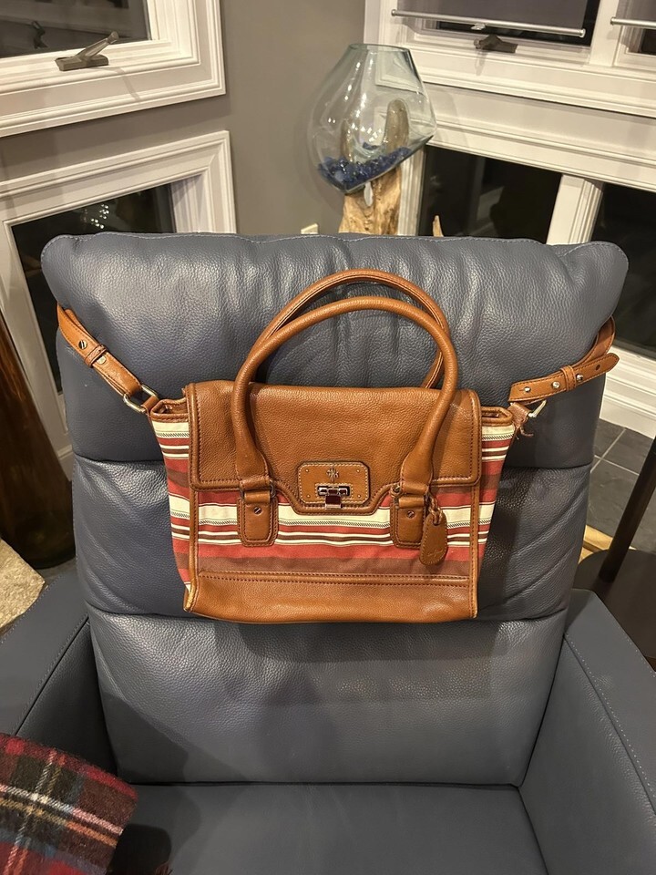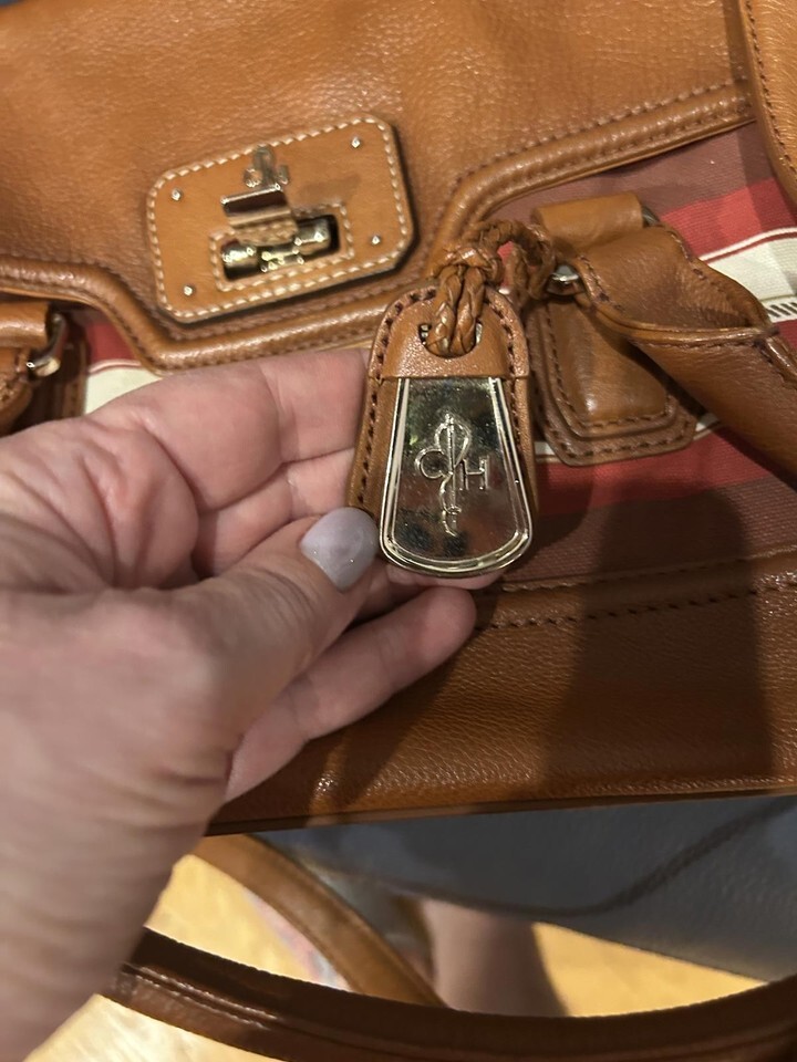 Cole Haan Brooke Flap Brown Leather Canvas Valise Hand Bag