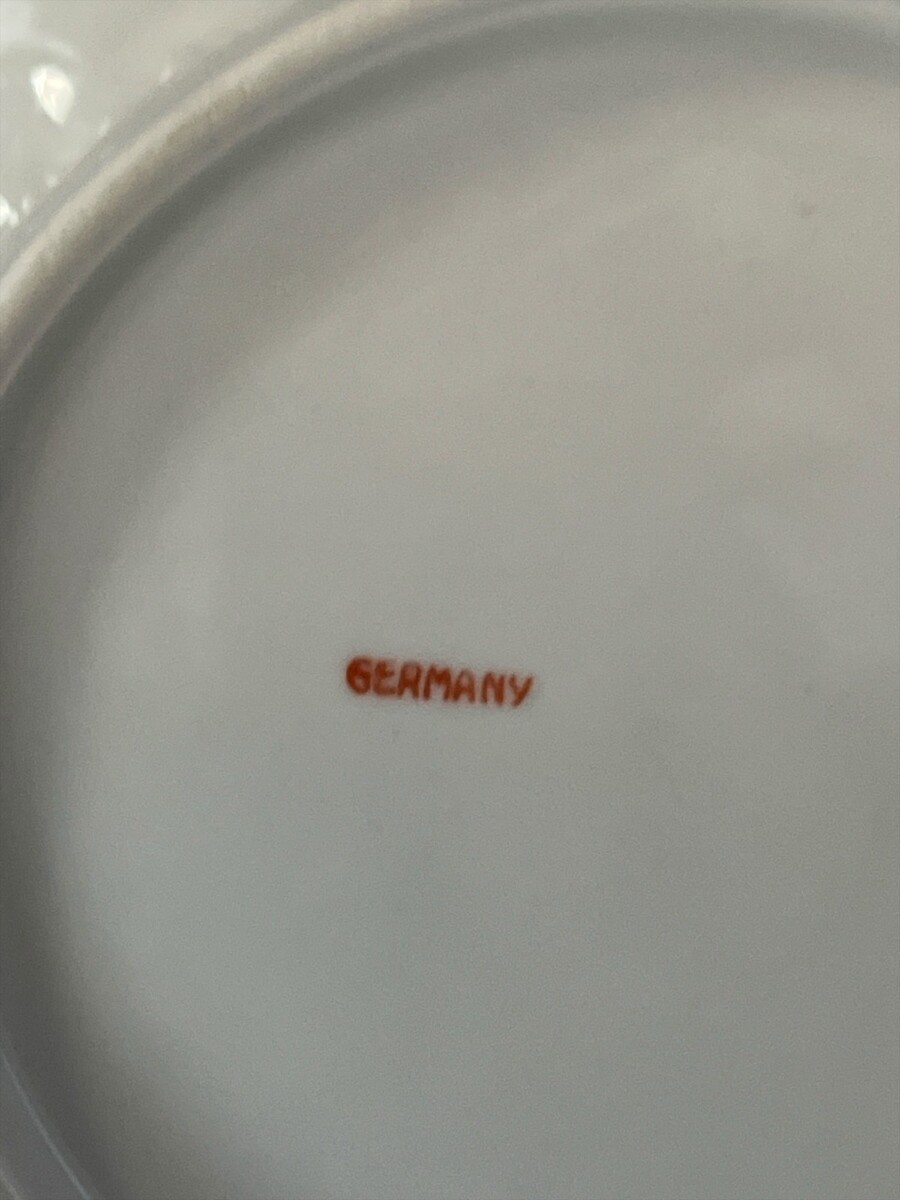 Charming vintage porcelain bowl made in Germany, featuring a delicate pink rose garland design with soft blue floral accents and a luminous iridescent luster rim. The shimmering edge catches the light beautifully, giving this piece a romantic, cottagecore feel. Perfect as a serving bowl or as a decorative accent for a shabby chic or vintage-inspired home.