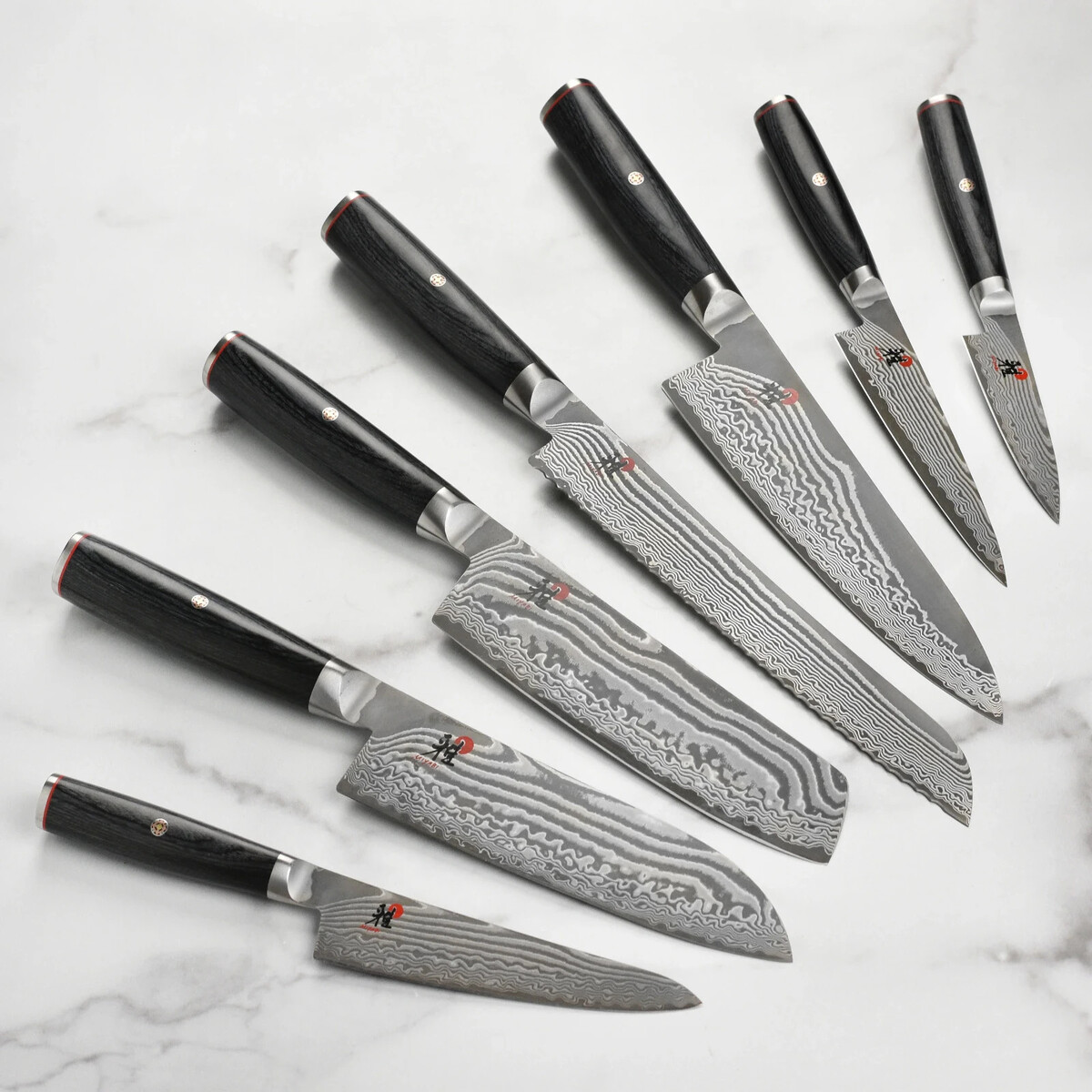 The Miyabi Kaizen II collection is a stunning example of the finest Japanese craftsmanship. Features excellent cutting edge retention and sharpness. The core of the blade is surrounded by 49 layers of steel which make up the unique Damascus design pattern on the blade. The Pakkawood handle sits comfortably in the hand, allowing firm control and tireless working.