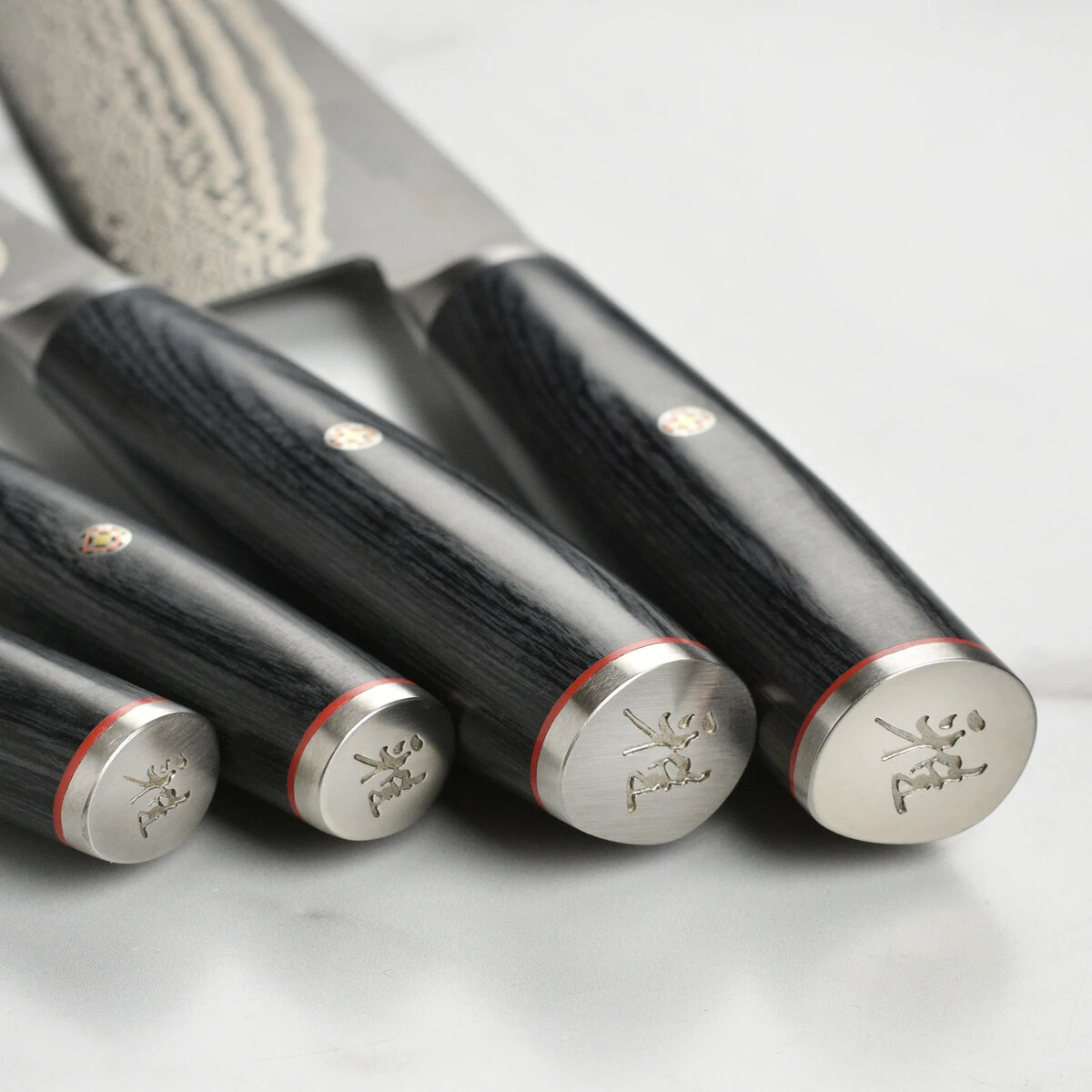 Larger steel bolster and Pakkawood handle with mosaic accent pin and red spacer, complimented by a steel end cap with logo