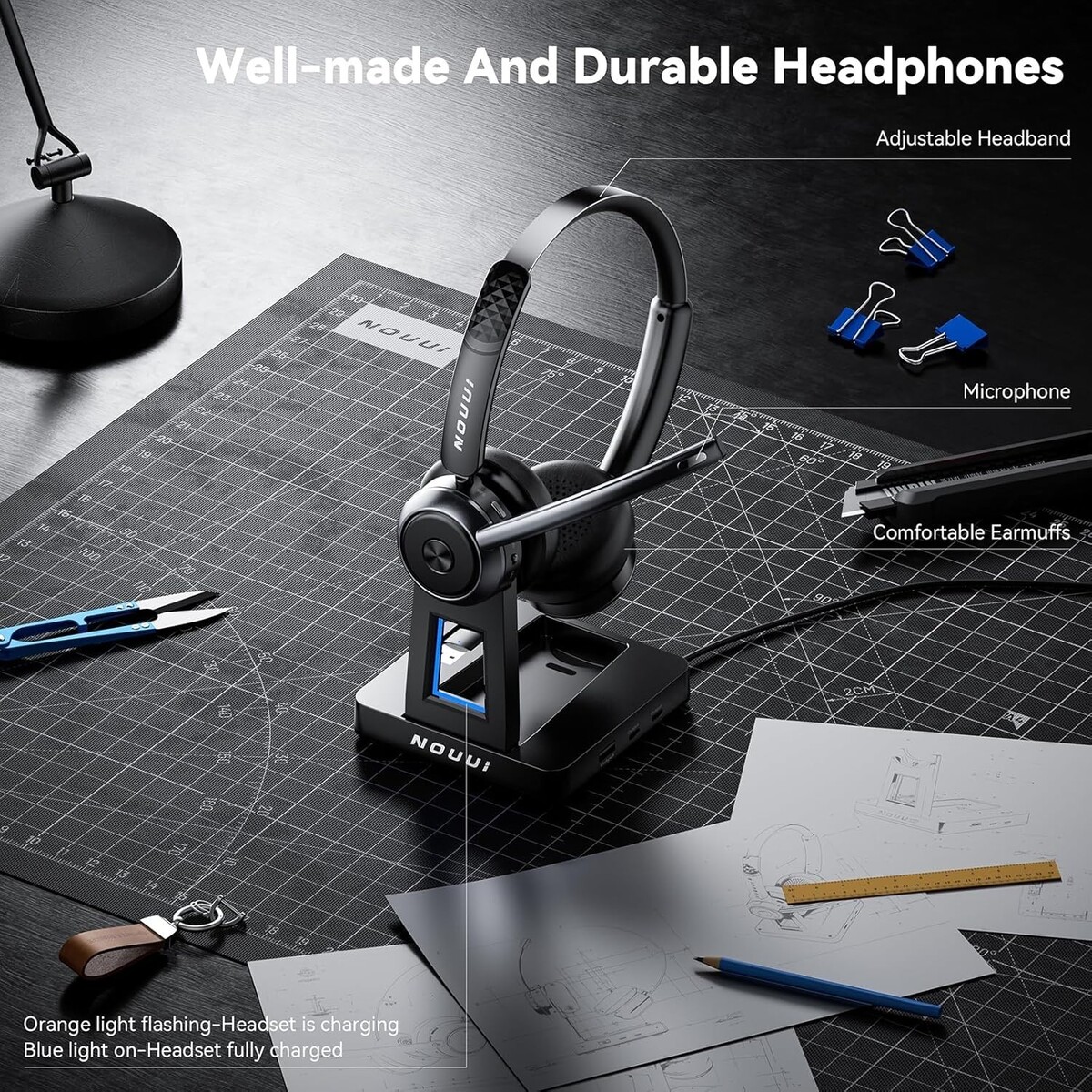 65-Hour Battery Life for a Full Week of Work: The wireless headphones with mic for work delivers up to 65 hours on just a 2-hour charge?enough for a full week of meetings, office shifts, remote work, or travel without battery anxiety. Charge via USB-C or place the wireless headset with microphone on the base for hassle-free charging. The base of bluetooth headset with microphone includes a slot to keep dongle secure, helping you stay productive at the office, on the road, or working from home