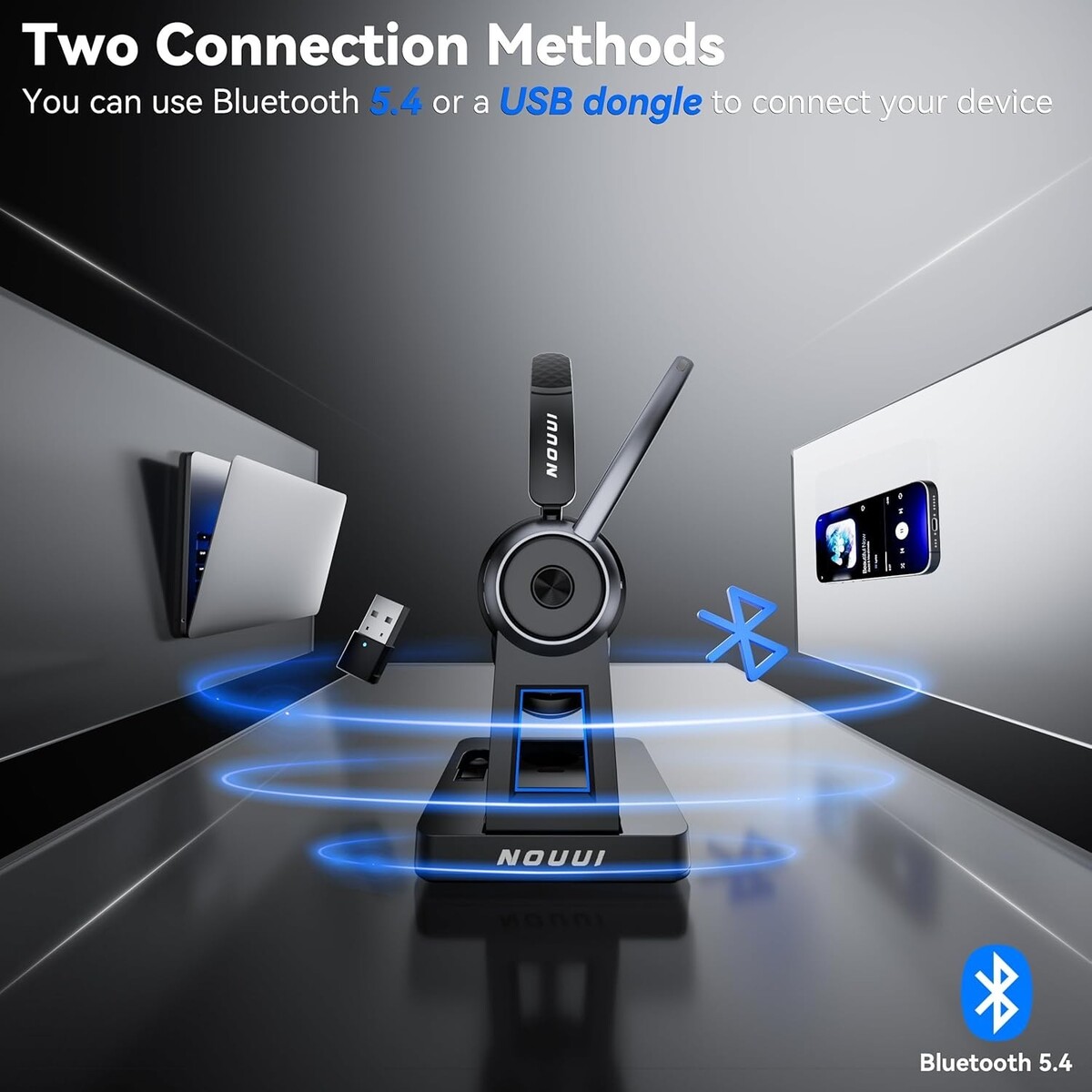 Stable Dual-Connection: The wireless headset with mic for work utilizes Bluetooth 5.4 for phones, delivering fast pairing, stable low-latency connection, and 50ft range. Or plug the included 2.4G USB dongle for a computer headset with microphone use?perfect for Windows laptop/PC without Bluetooth. Select the dongle as your headset with microphone for PC to improve connection consistency for calls(Connects to one device at a time) . Perfect for hybrid workers, call center staff, multitasking pros