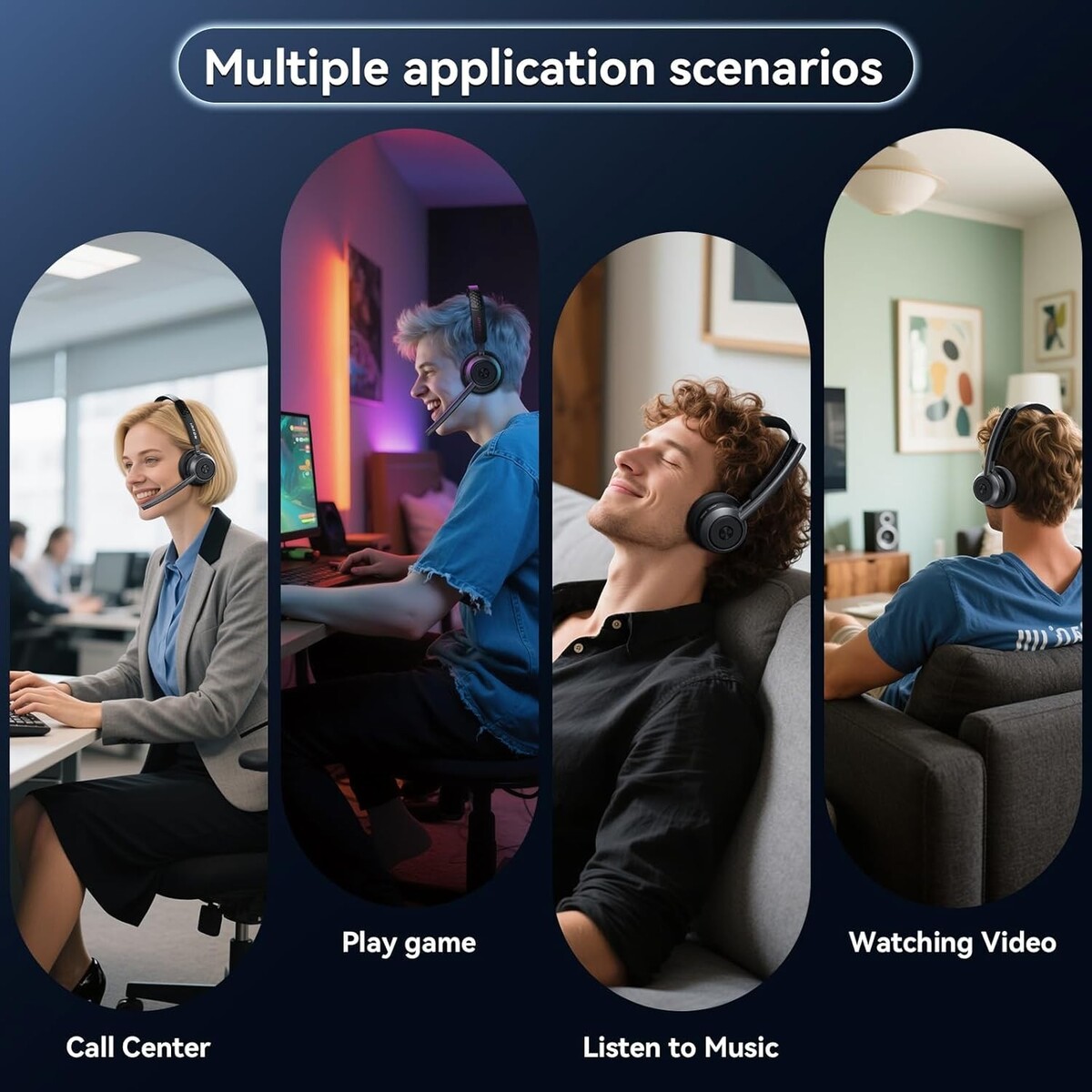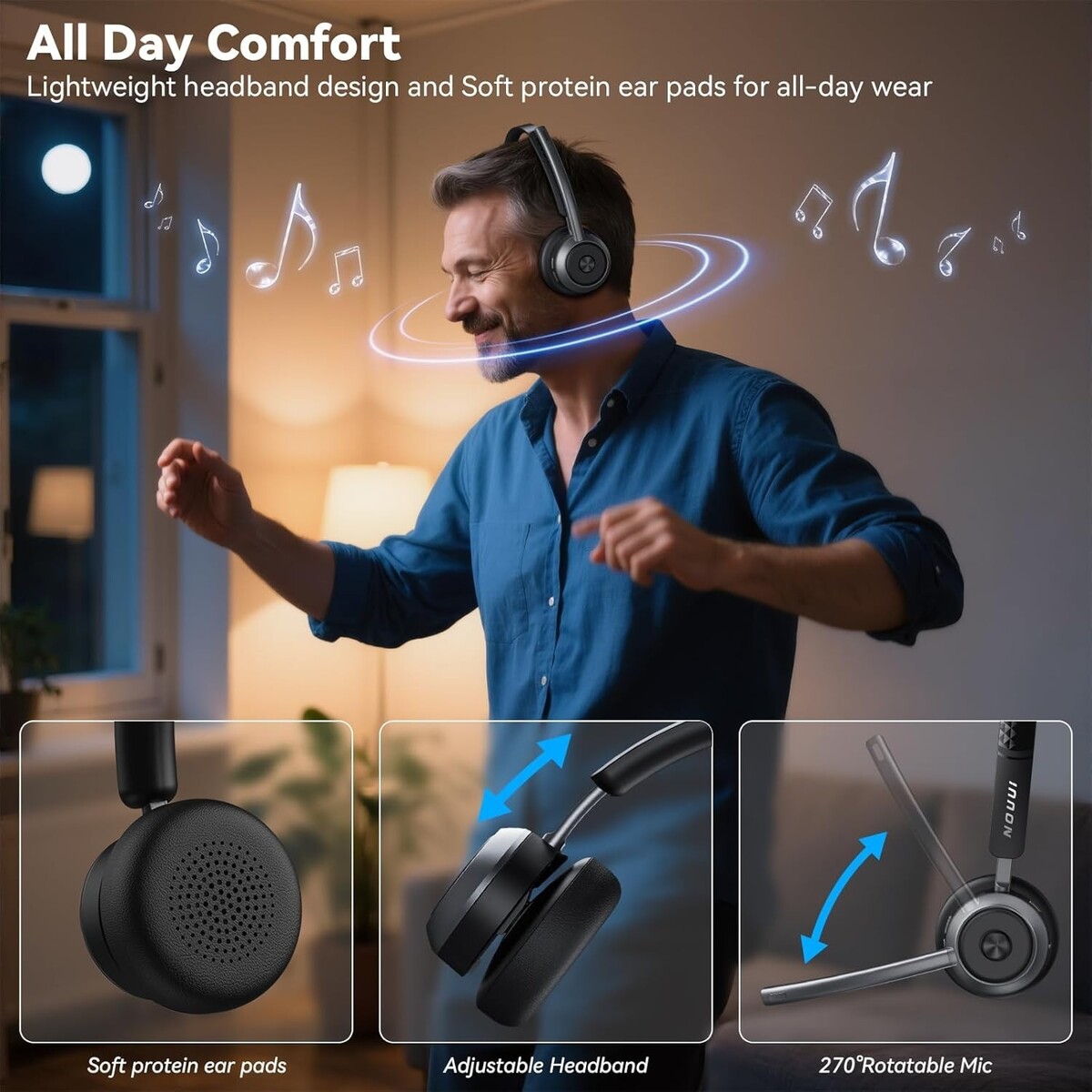All-Day Comfort Easy Control: Soft protein-leather ear cushions, a lightweight frame, and an adjustable headband reduce pressure for 8+ hour wear?great for call center shifts and long meetings. The 270 rotatable boom mic lets you wear left/right, while onboard buttons make it simple to answer, mute, and adjust volume. A wireless headset with mic for work offers both comfort functionality, making every conversation smooth, focused, and fatigue-free. Ideal for remote work, warehouse workers