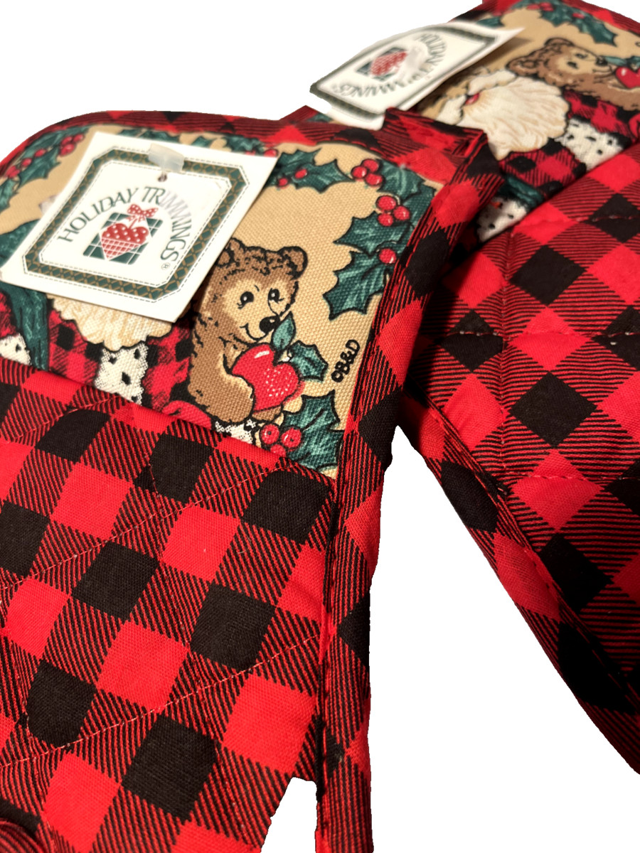 Holiday Trimmings Oven Mit Set Red Black Buffalo Check Santa Christmas Holiday