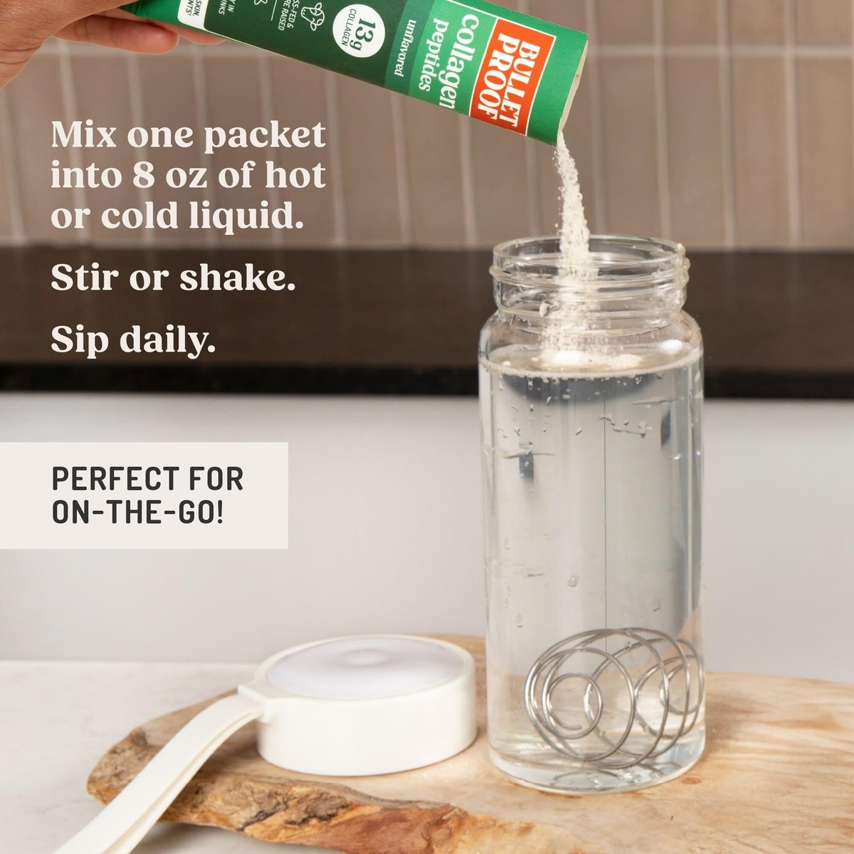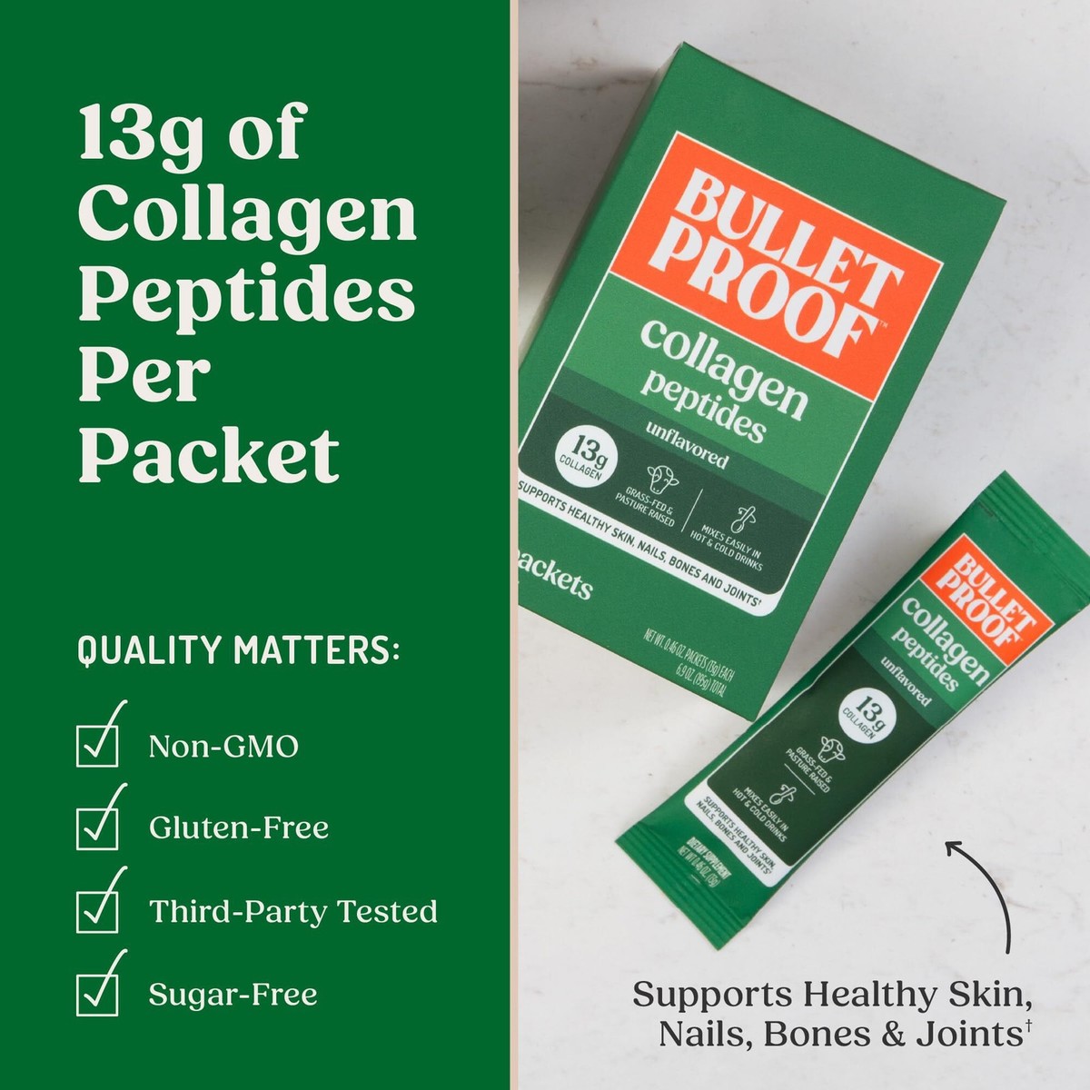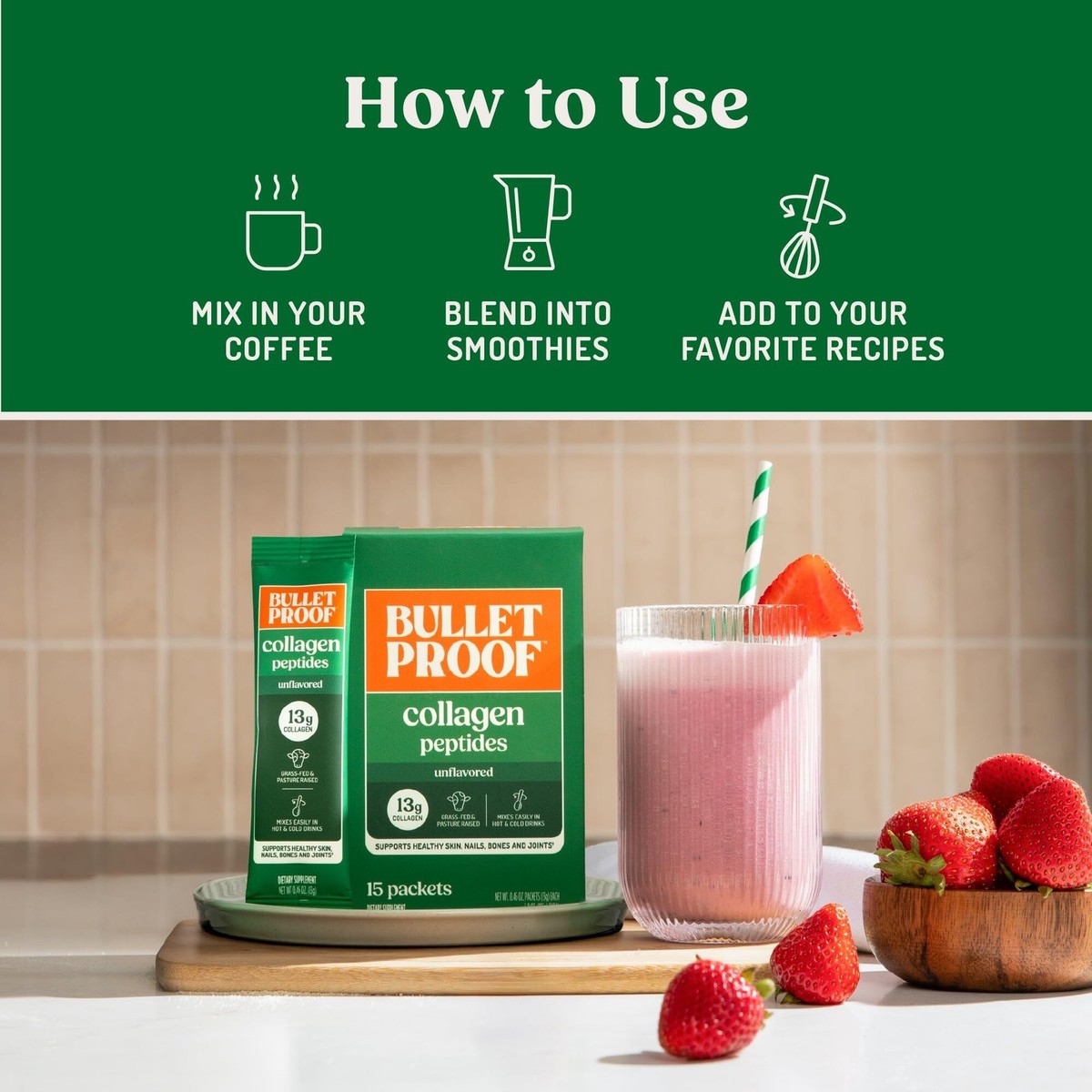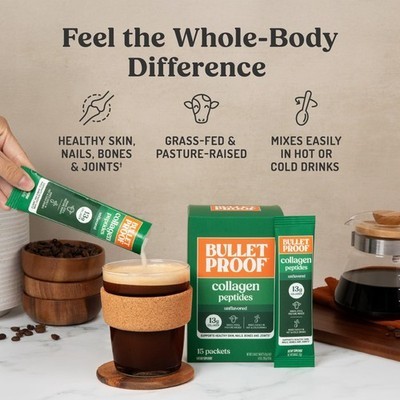 Expiration Date of 7/08/2027 ? Contains 15 packets of Bulletproof Unflavored Collagen Peptides ? Our keto-friendly Collagen Peptides help maintain skin, bone and joint health. And we only use collagen types I and III, which are the most common, naturally occurring types in the body ? Every serving of Collagen Peptides has 13g of collagen, no added sugar and mixes easily into hot or cold water; add to coffee, smoothies, soups and more ? Collagen Peptides provide three amino acids that you won't find in meaningful amounts in other commonly eaten proteins ? At Bulletproof, we only use science-backed ingredients to deliver maximum benefit. For a simple, consistent source of collagen, add Collagen Peptides to your diet