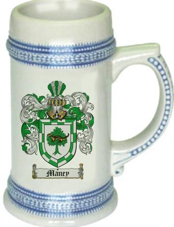 Maney Family Crest Stein / Coat of Arms Beer Tankard. We believe our Coat of Arms Steins are of the highest quality anywhere. The glassware quality is very thick and sturdy. The stein feels great in your hand with a very thick handle. Fill this glass with your favorite beer or beverage. keywords: steins, beer, german, glass, glassware, cup, tankard, goblet, family shields, shield, family, genealogy, heraldry, code of arms