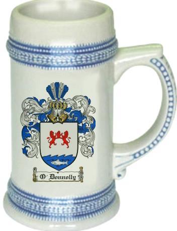 O'Donnolly Family Crest Stein / Coat of Arms Beer Tankard. We believe our Coat of Arms Steins are of the highest quality anywhere. The glassware quality is very thick and sturdy. The stein feels great in your hand with a very thick handle. Fill this glass with your favorite beer or beverage. keywords: steins, beer, german, glass, glassware, cup, tankard, goblet, family shields, shield, family, genealogy, heraldry, code of arms