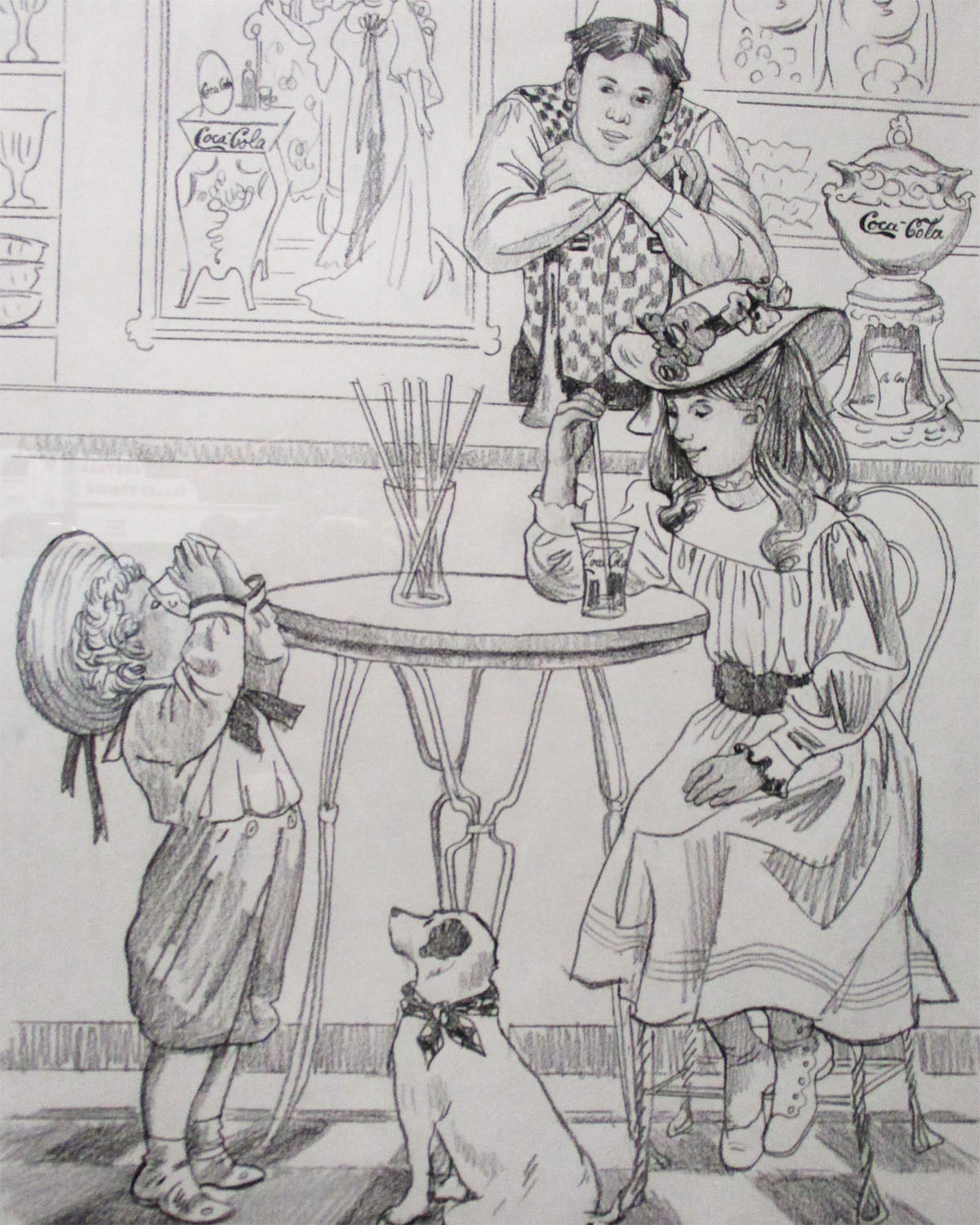 An original framed pencil sketch by Lee Dubin featuring two small Victorian children enjoying their visit to their favorite soda fountain. The unique feature of this sketch is Lee's ability to capture the facial expression in pure happiness enjoying their fountain drinks. The framed sketch measures 28" tall by 23" wide