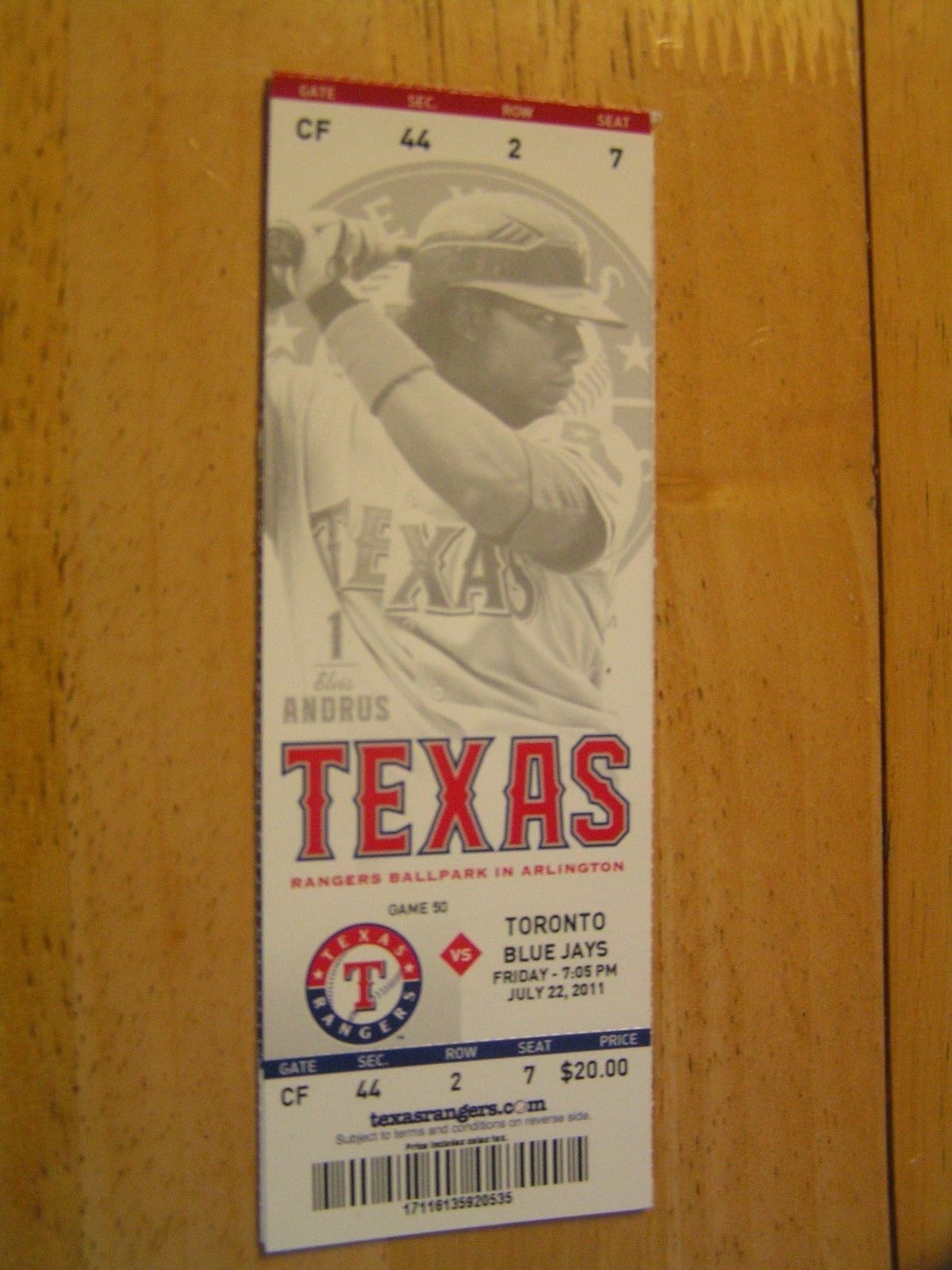 2011 Texas Rangers Full Unused Ticket Stub Vs Toronto Blue Jays 7/22