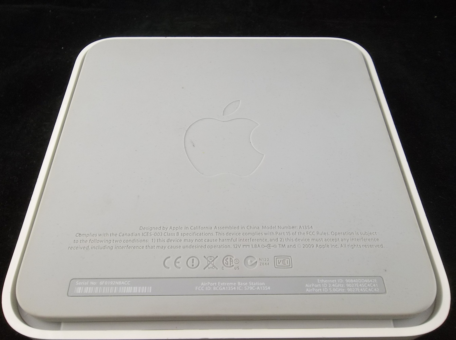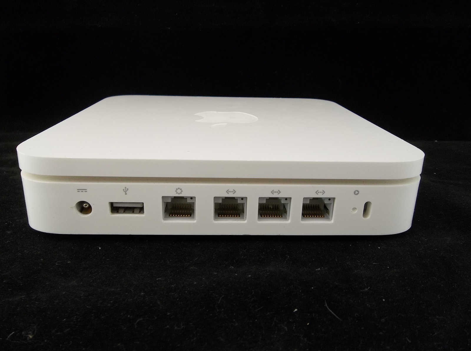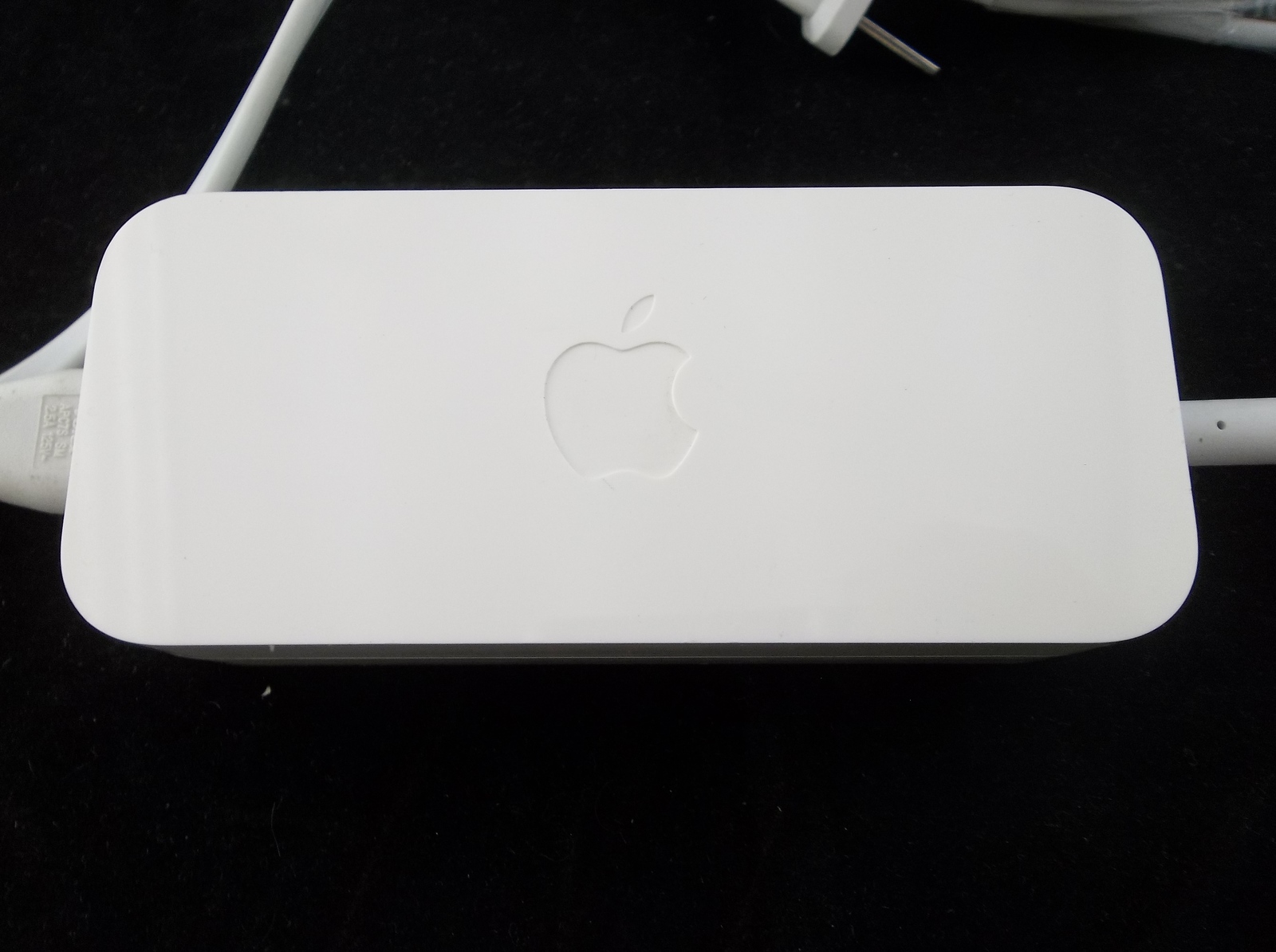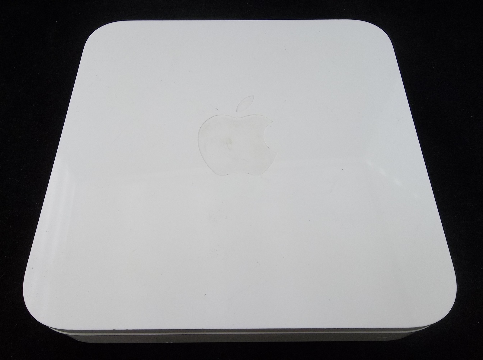 Condition: The router is in good used condition. The exterior casing is in good shape. It has some marks and scratches from age, use, and storage. All connections look to be in good shape. The power cord has some marks on it from use but it has no cuts or breaks. The power brick isn't cracked or broken. I have not tested the working condition of this device since I don't use MAC's. I did plug it in and it did appear to power up. A green light lit up as soon as I plugged it in, it went off, then a yellow/orange light stayed on.