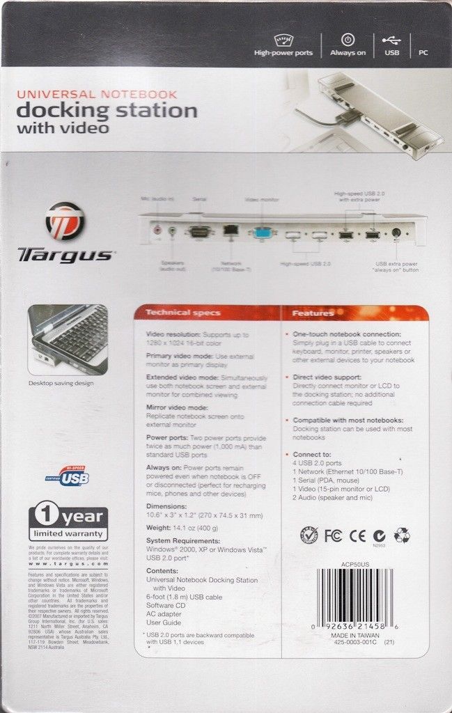 TARGUS ACP50US USB UNIVERSAL NOTEBOOK DOCKING STATION WITH VIDEO & AUDIO - NEW!