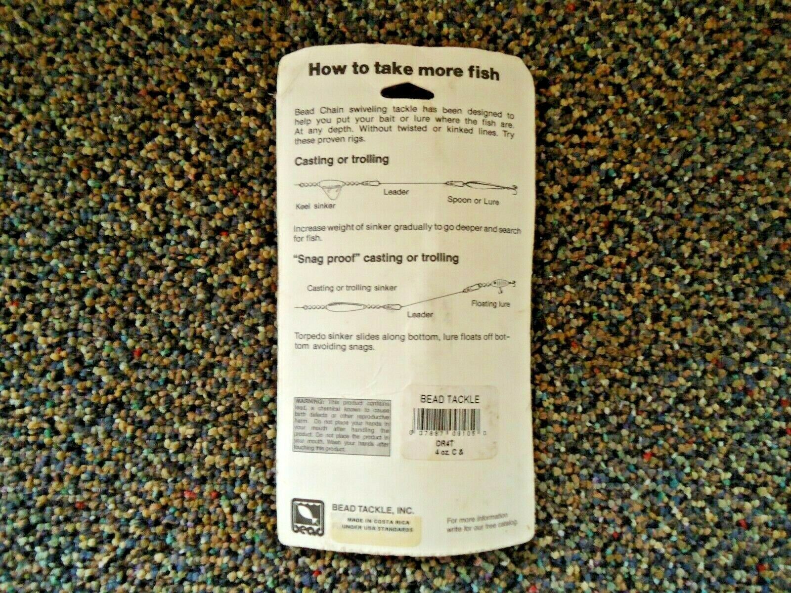 Here is a " NOS " Bead Tackle 4 Oz.Torpedo Sinker For Casting Or Trolling " GREAT ITEM ".If you have any concerns or questions about this item(s) please ask before bidding / purchasing because this item(s) is being SOLD AS IS.Thank You.-(PC22)