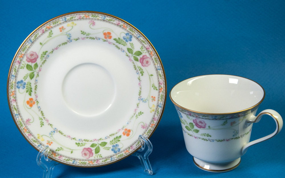 Noritake China, Finale footed cup and saucer set, Pattern No. 7213, in excellent, pre-owned, like new condition. The saucer is 6" in diameter. The china is decorated with a pastel, multi-colored flowers with green leaves. Gold trim. This china was produced between 1976 and 1982. Shipping cost will be adjusted for multiple items purchased. Please email any questions.