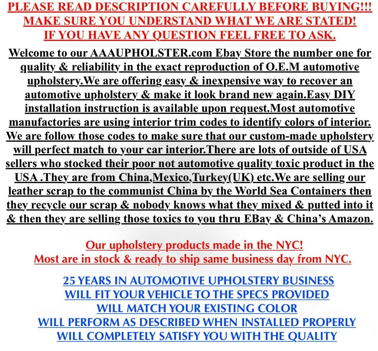 BRAND NEW ORIGINAL STYLE REPRODUCTION OF UPHOLSTERY FOR BOTH FRONT SEATS.