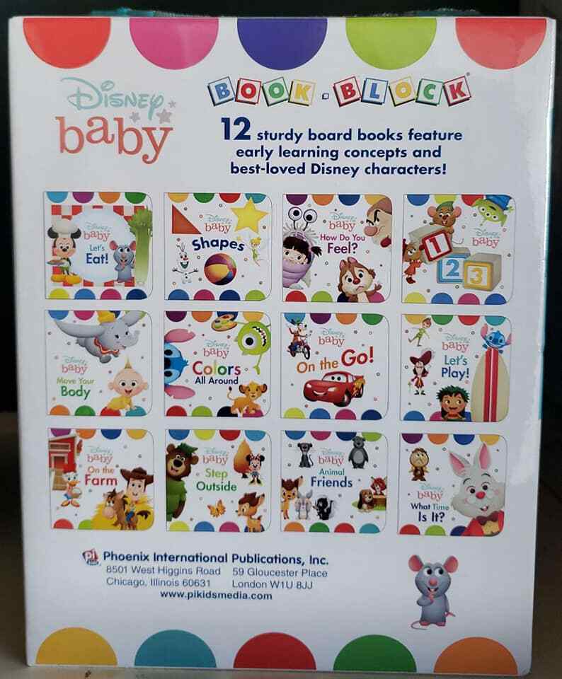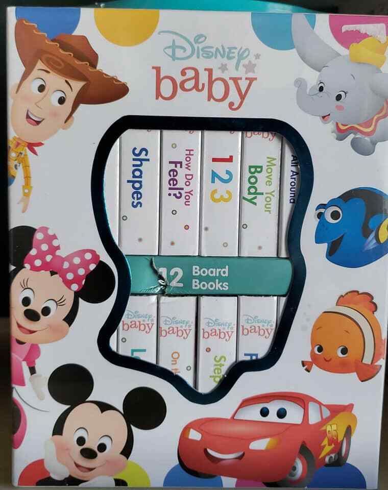 Your little one will love to learn with classic and modern Disney and Pixar characters from Disney Baby! The library includes 12 sturdy board books - the perfect size for little hands - with early learning content including words, numbers, shapes, feelings, and more. All the books are housed in a durable, colorful case with convenient handle so you can take your book set with you on the go and share hours of entertainment and learning!