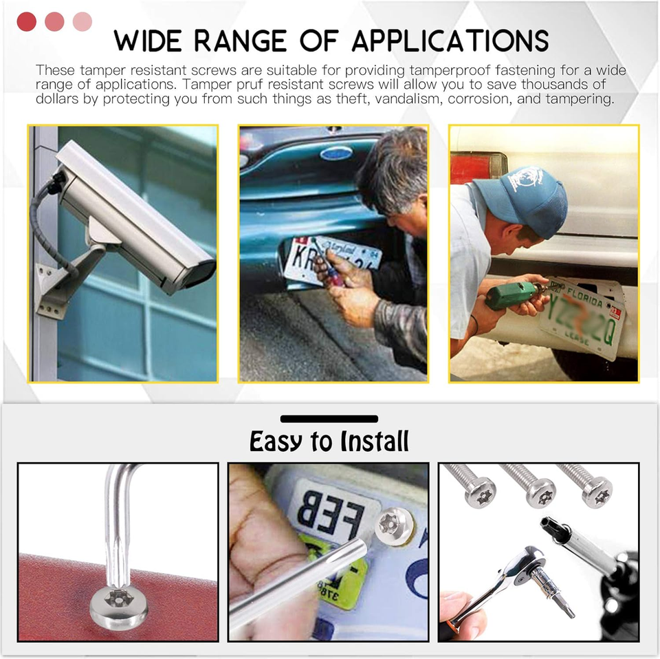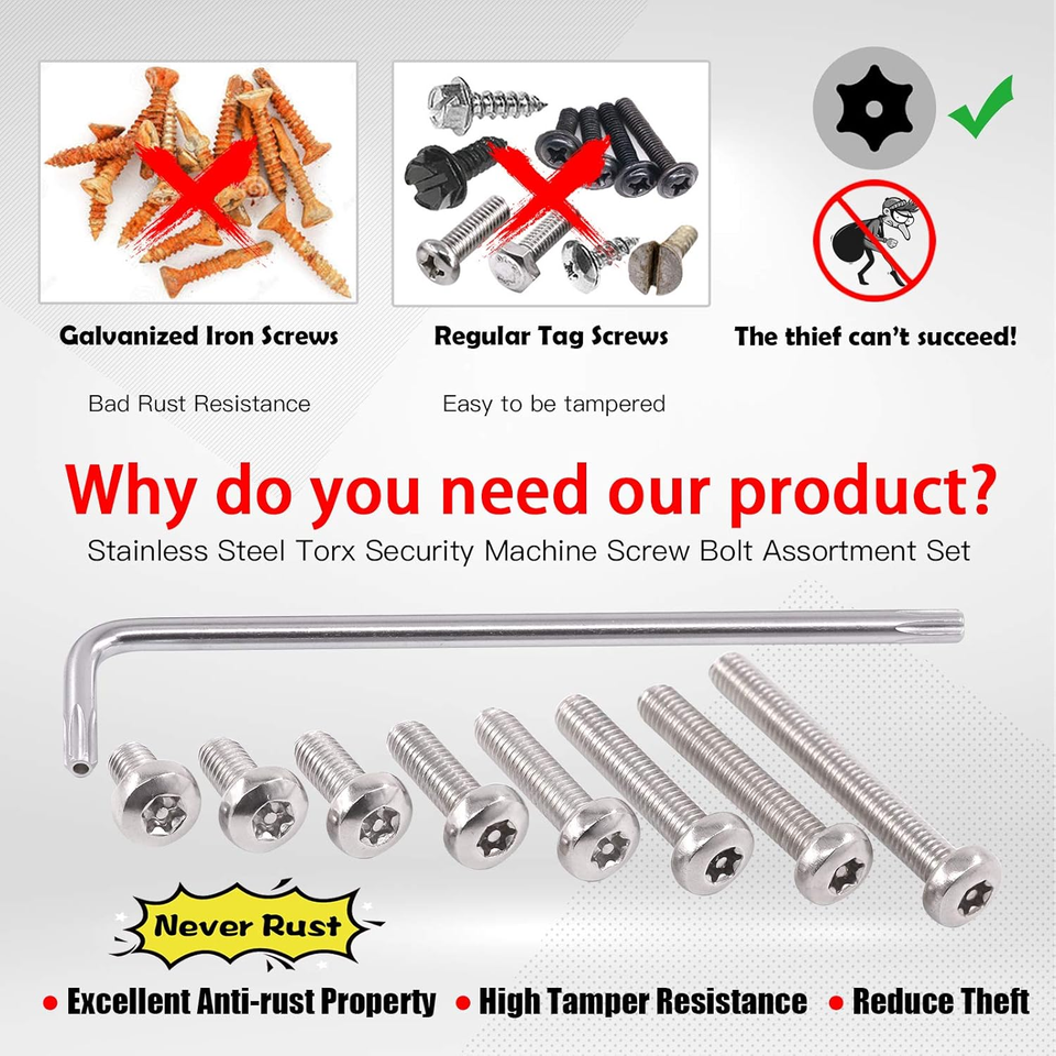 ??PROVIDE SAFETY?These stainless screws feature special structure and they have special anti theft function. These screws have great applications to prevent accidents or theft such as: outdoor guardrails, framed artwork, security camera, locks, electronic products, household appliances, public facilities and so on.